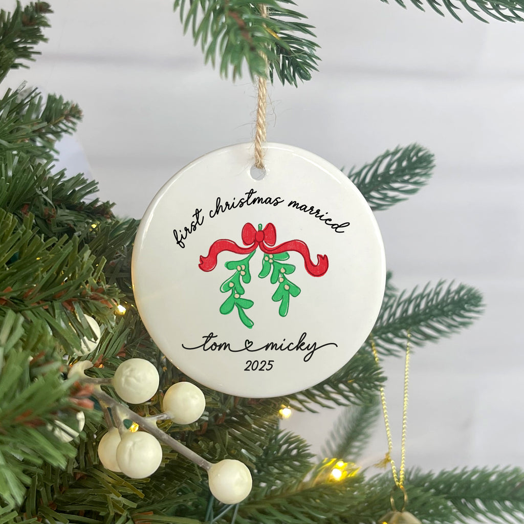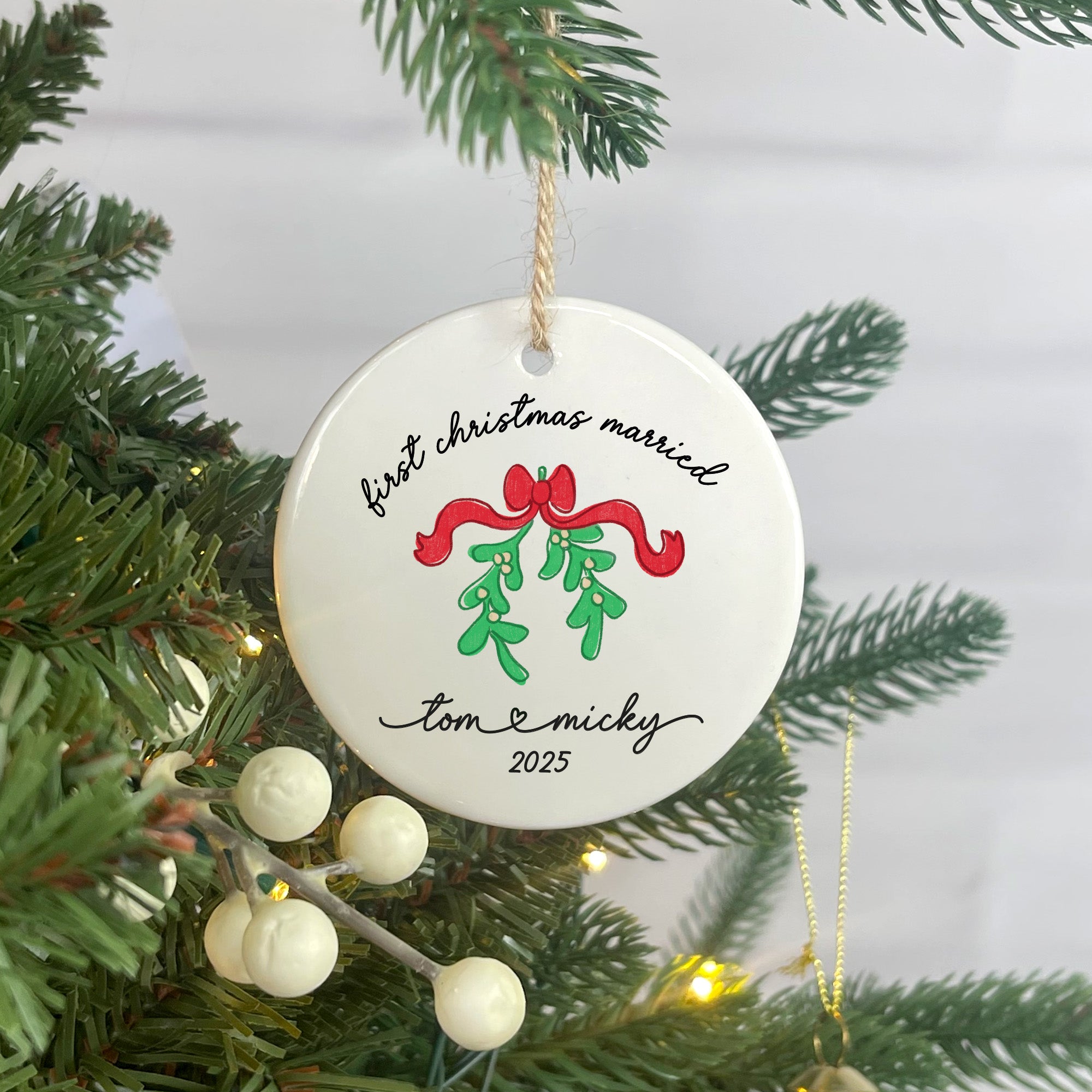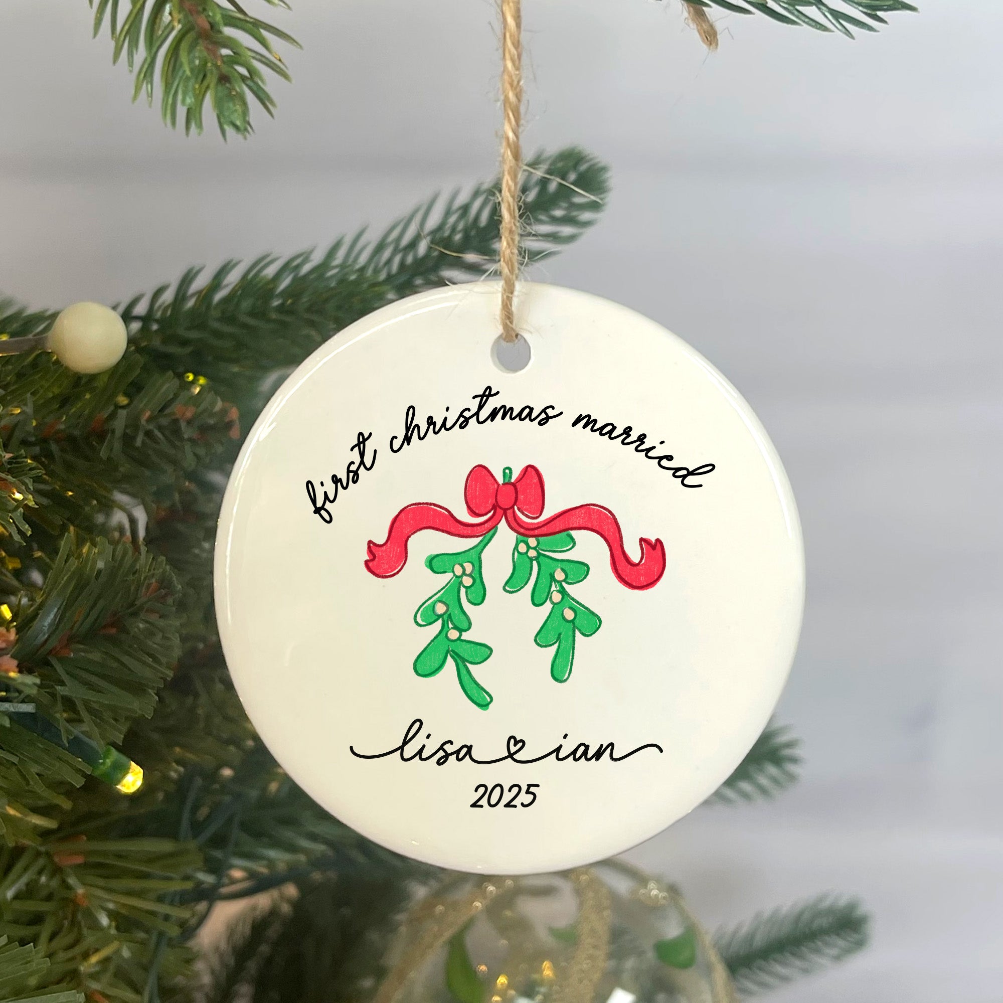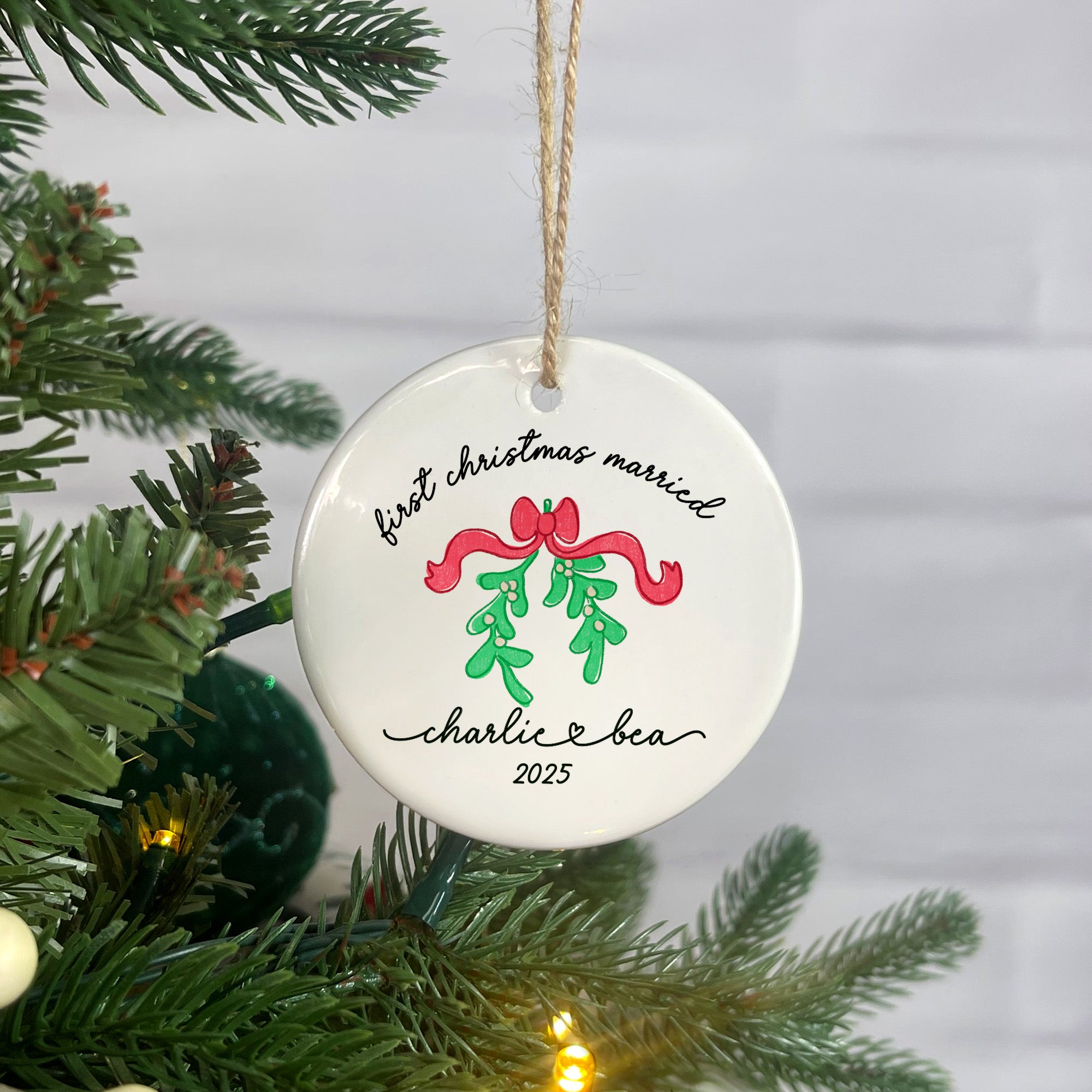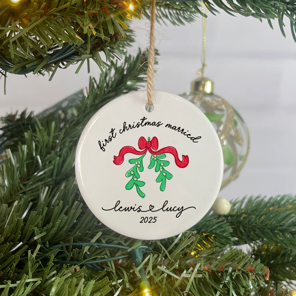 This beautiful ceramic bauble, complete with natural jute twine, features a charming mistletoe design and the wording “First Christmas Married”, professionally printed for a crisp, lasting finish. Personalise your ornament with the couple’s names and year, creating a heartfelt memento to treasure for years to come.