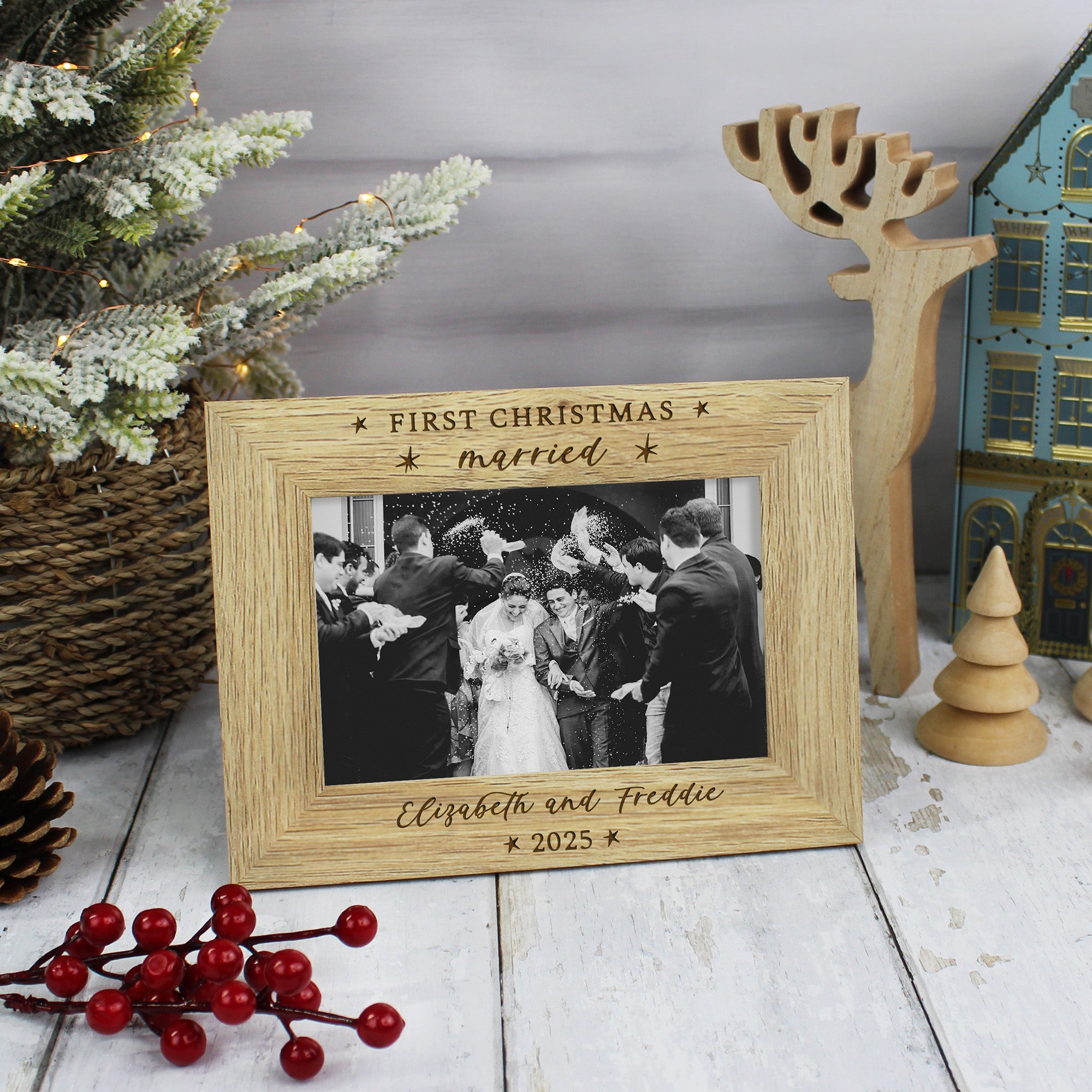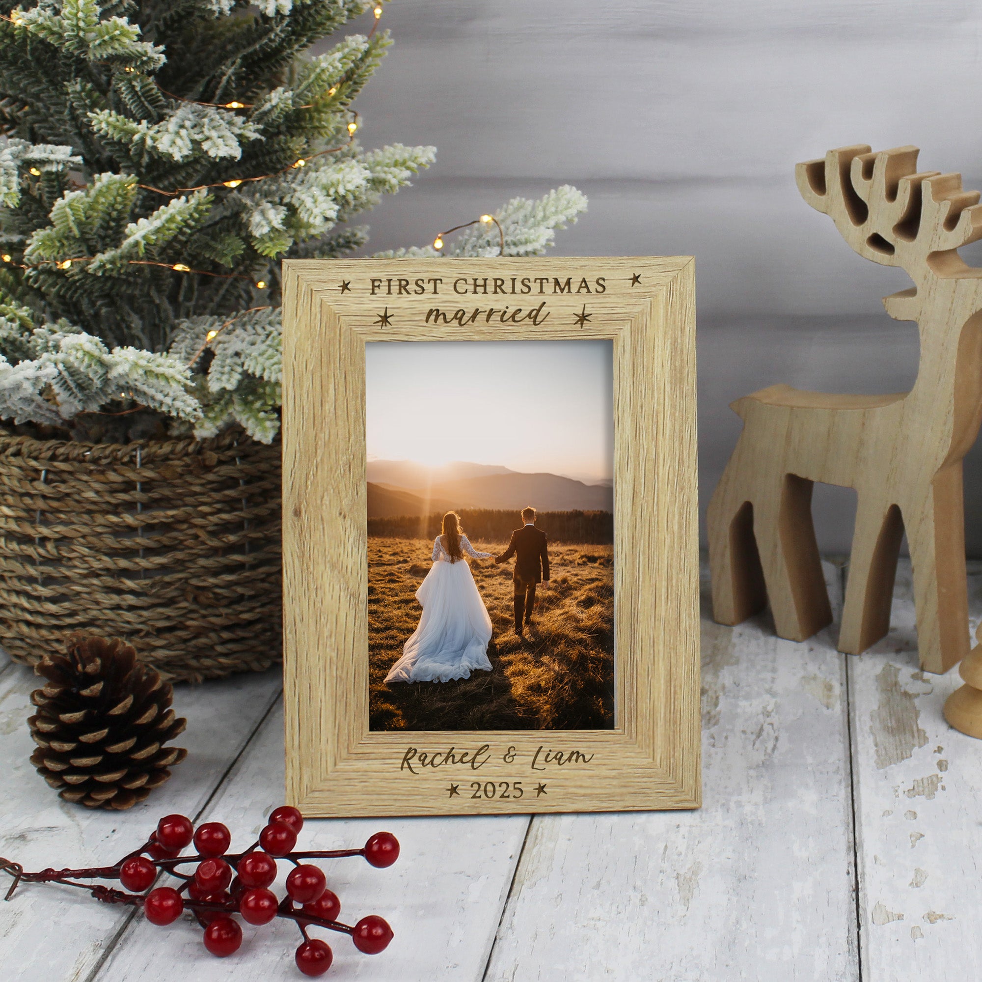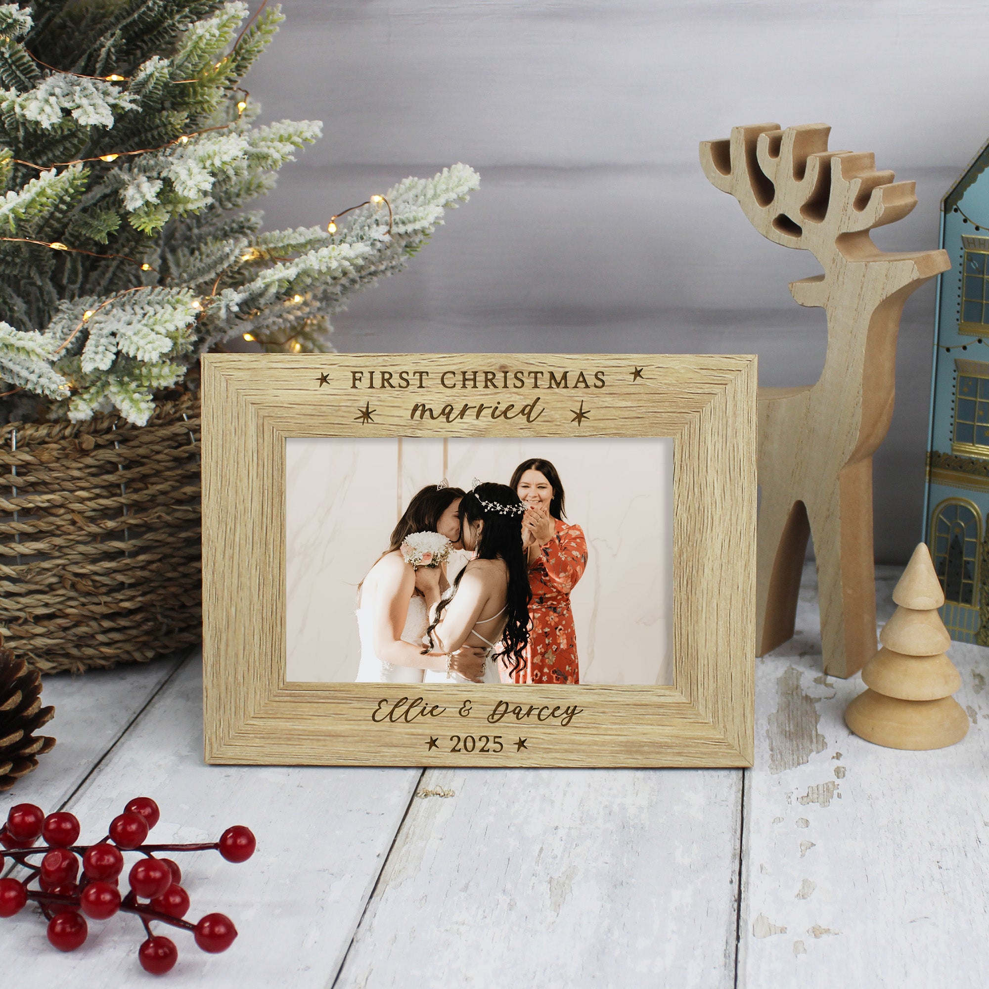 Celebrate your first Christmas as newlyweds with this beautiful Personalised Wooden Photo Frame, a keepsake designed to capture one of life’s most magical moments. Engraved with “First Christmas Married” at the top and personalised with the couple’s names and year at the bottom (e.g. Megan & Sean 2025), this frame makes the perfect festive reminder of your first holiday season as Mr & Mrs.
