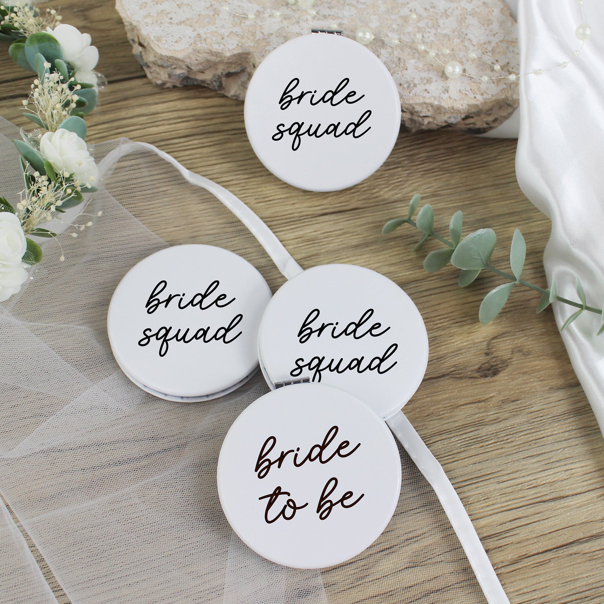 Each mirror features a sleek white design with “Bride Squad” elegantly printed in black, symbolising unity, elegance, and celebration. To make the bride shine even more, she has her very own exclusive white mirror, labelled either “Bride” or “Bride To Be.”