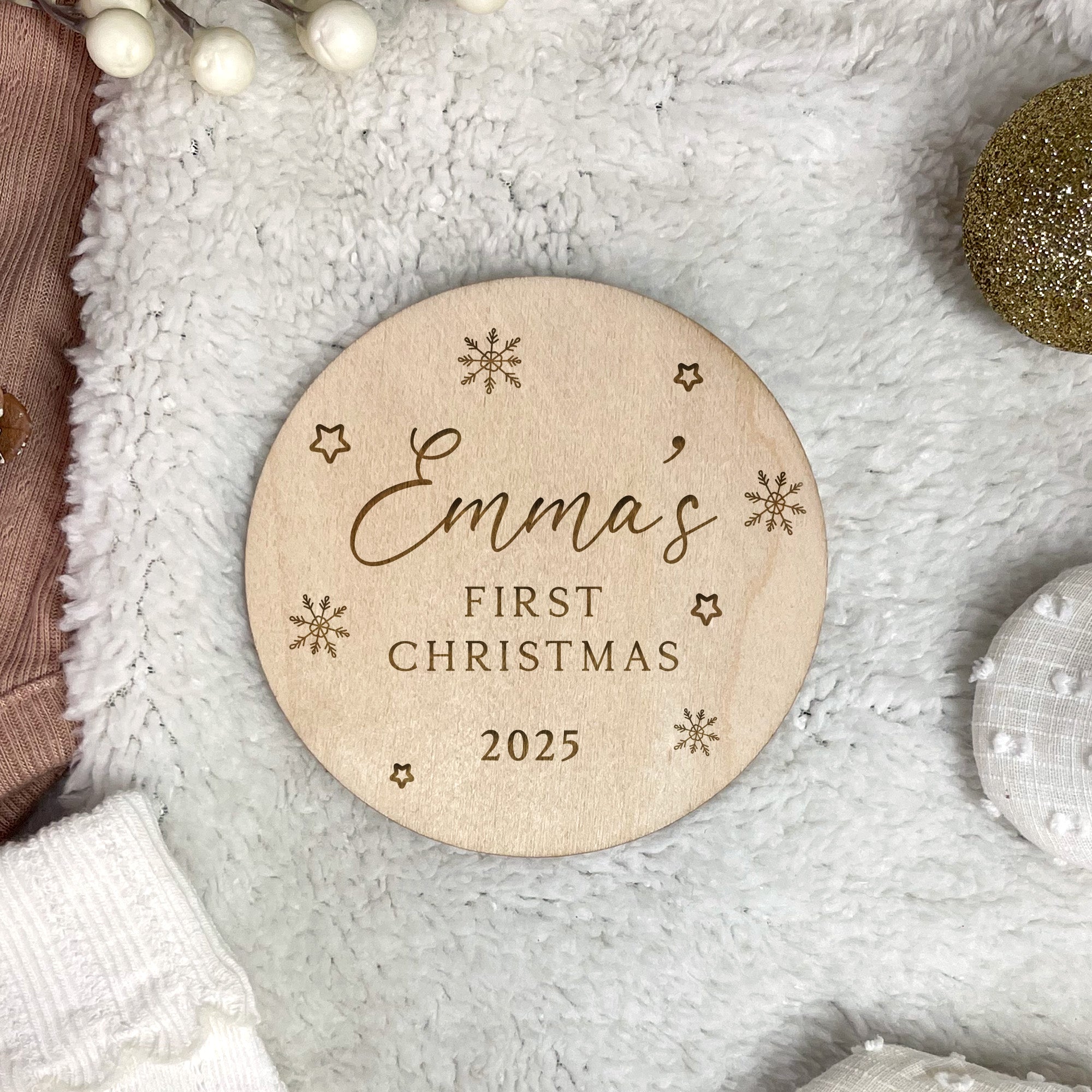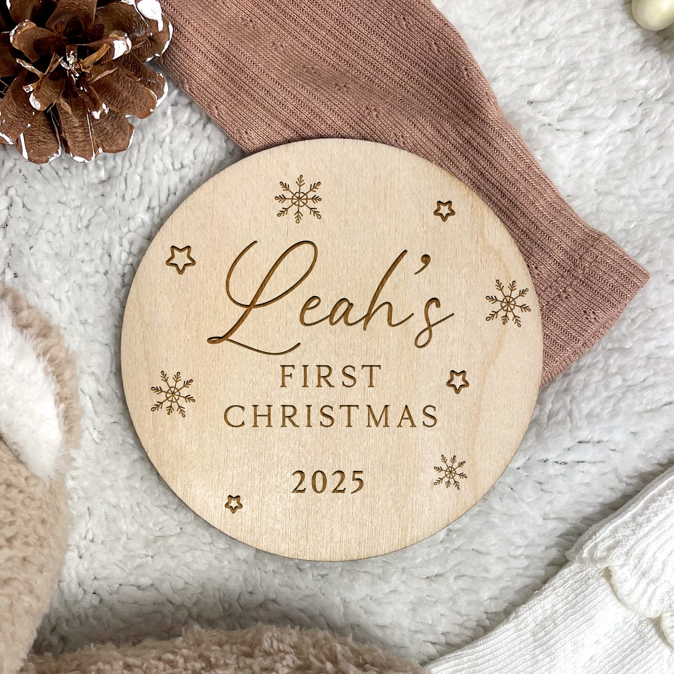 Perfect for flat lay photos, milestone moments, or nursery décor, this beautiful round wooden plaque is personalised with your child’s name and the wording “First Christmas 2025”, creating a treasured memento to cherish forever.