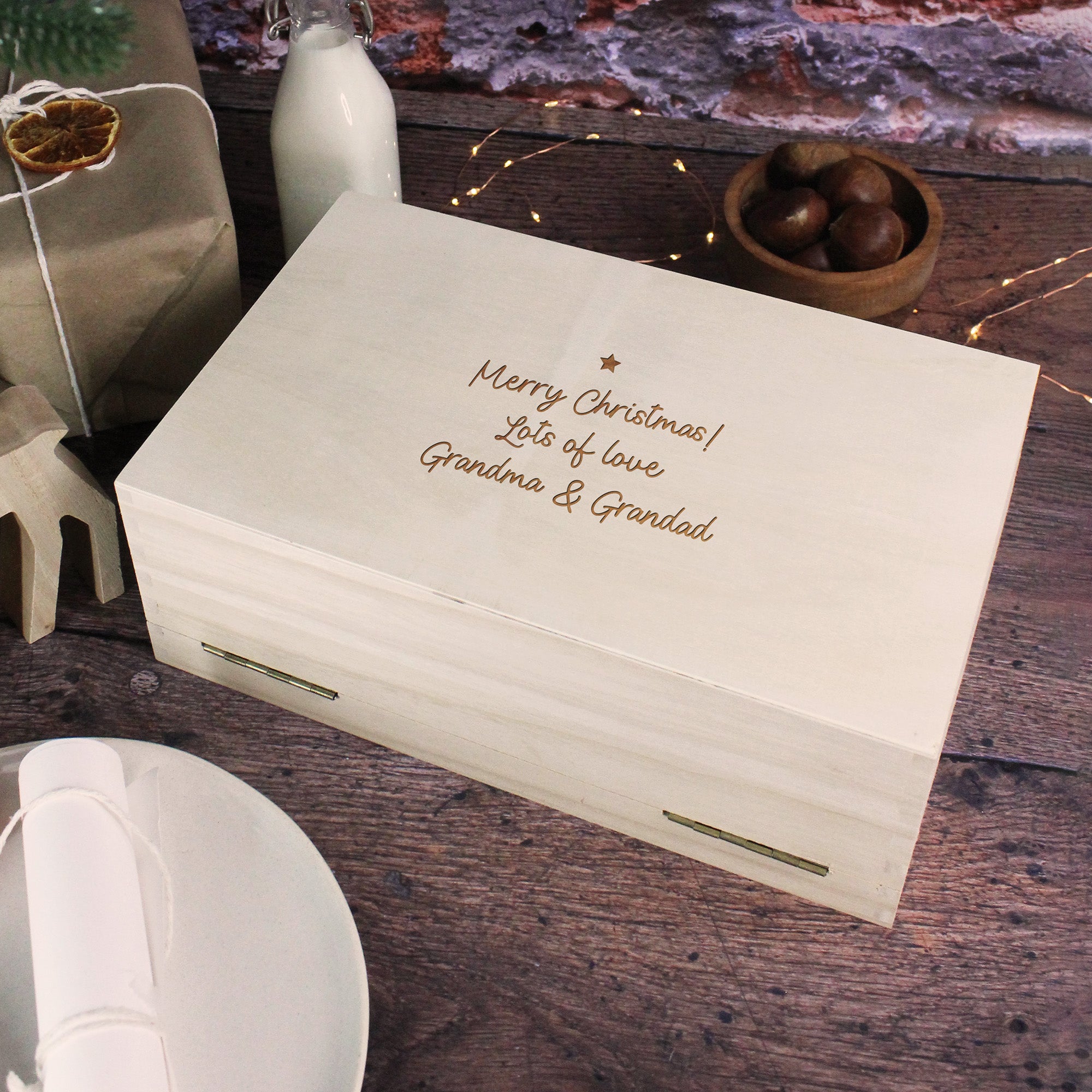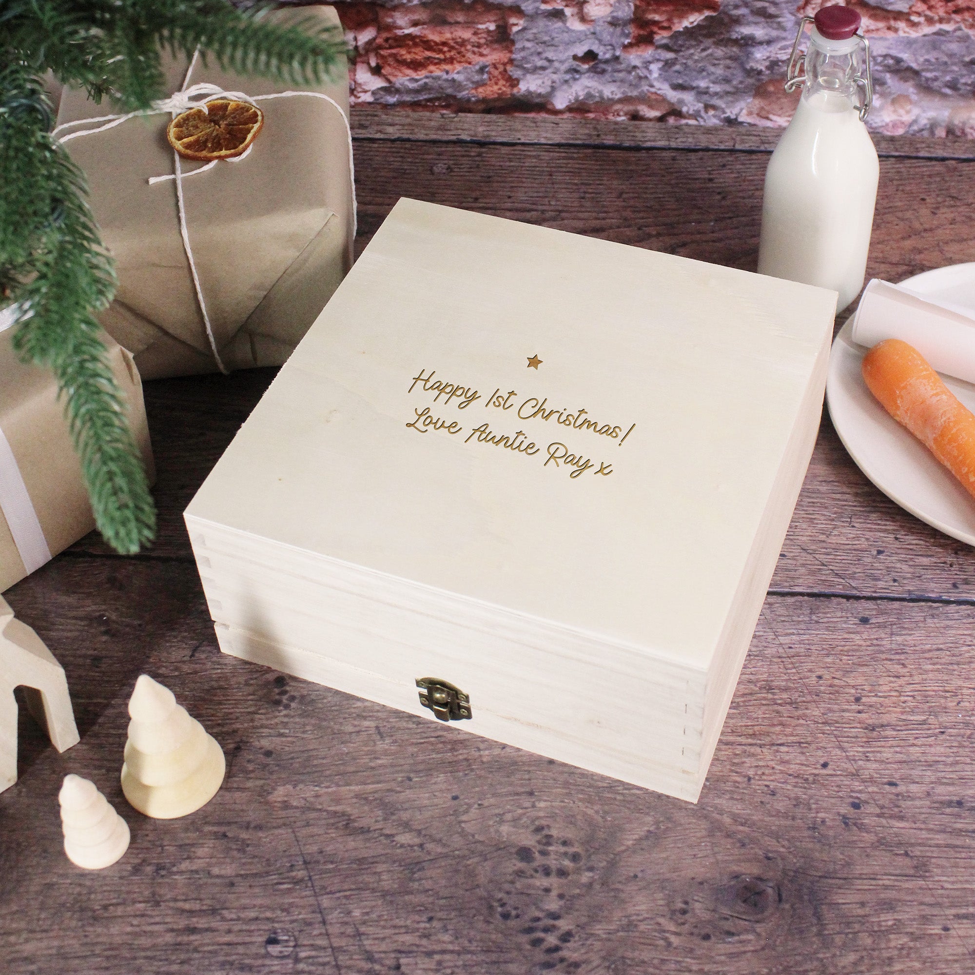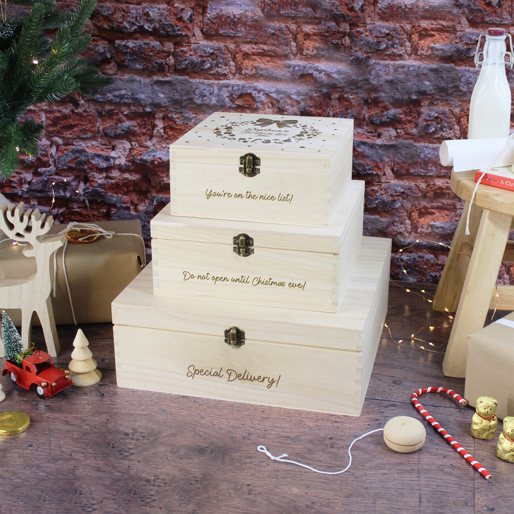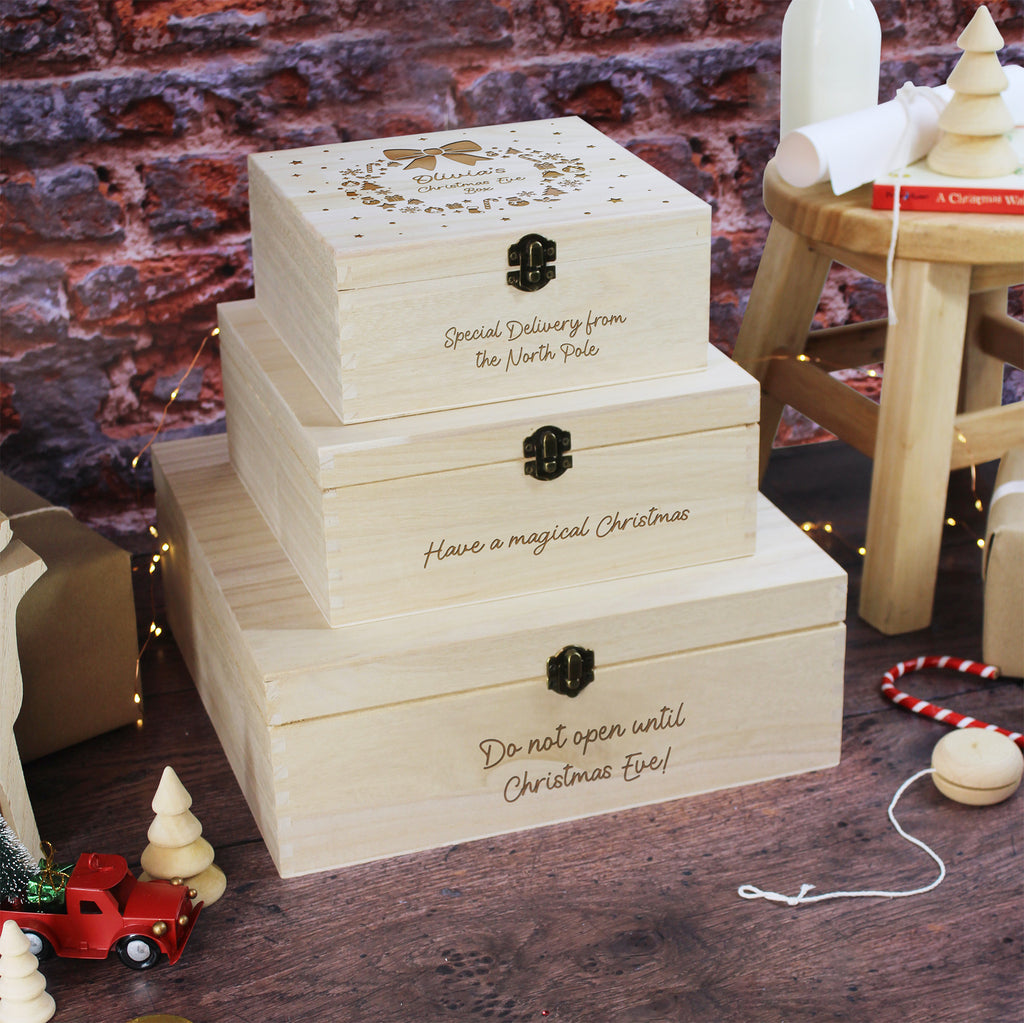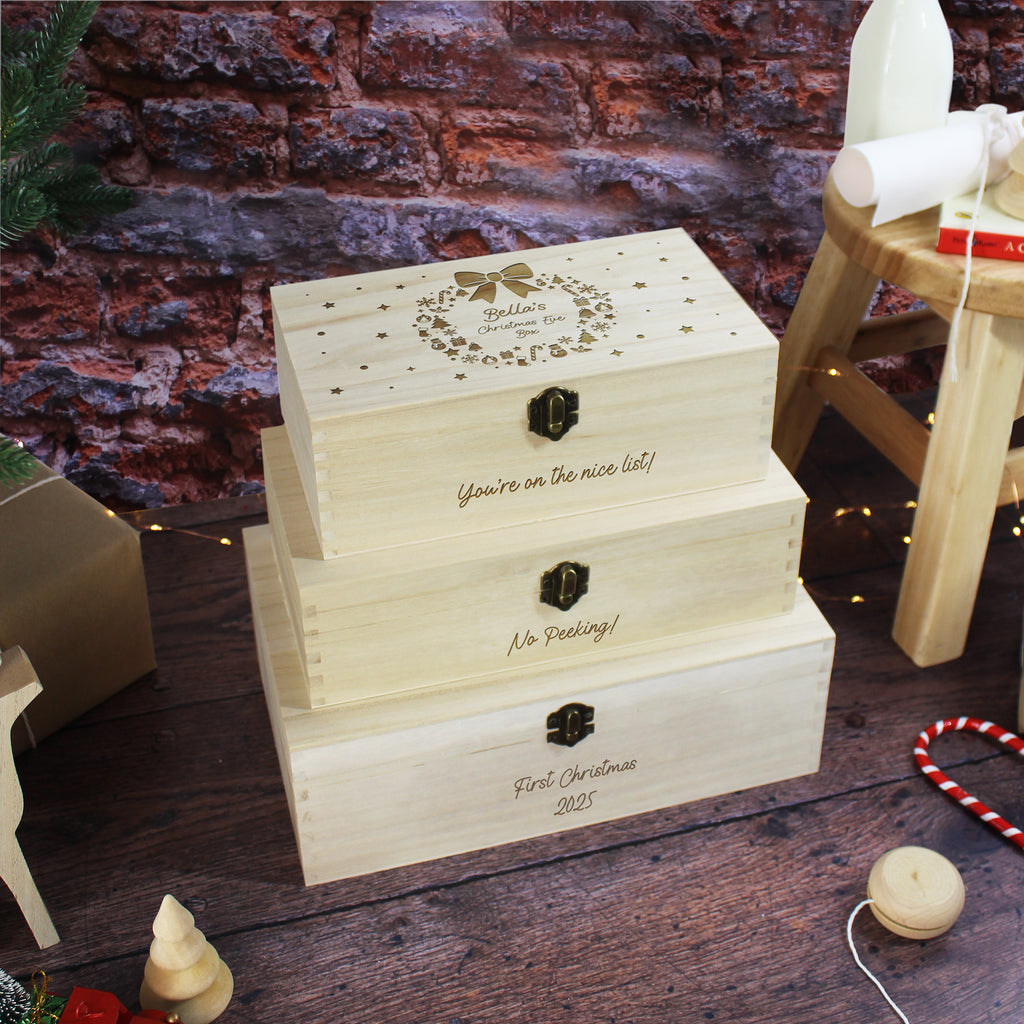 Available in a range of sizes and styles, including rectangular and square boxes with optional gold clasp closures, our wooden Christmas Eve crates are crafted from high-quality natural wood — durable, timeless, and full of charm.