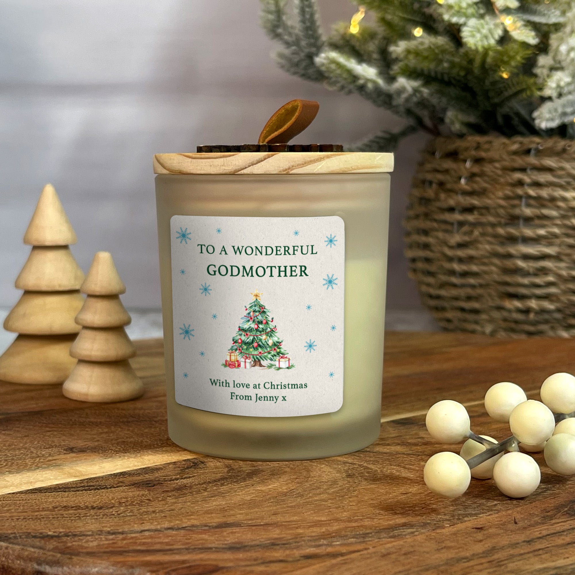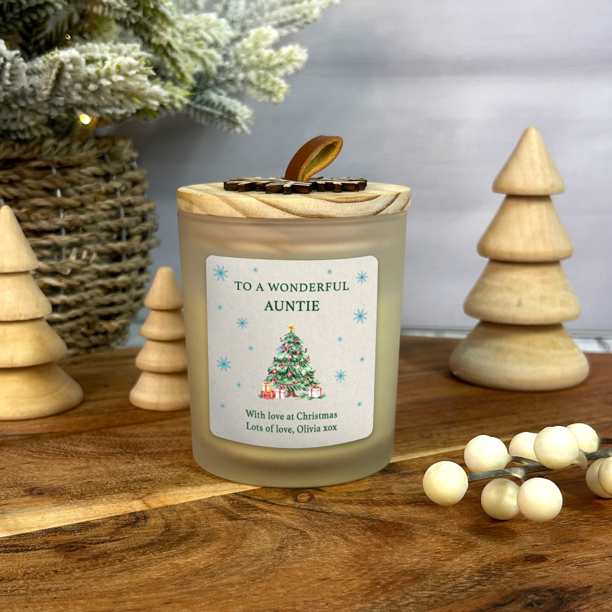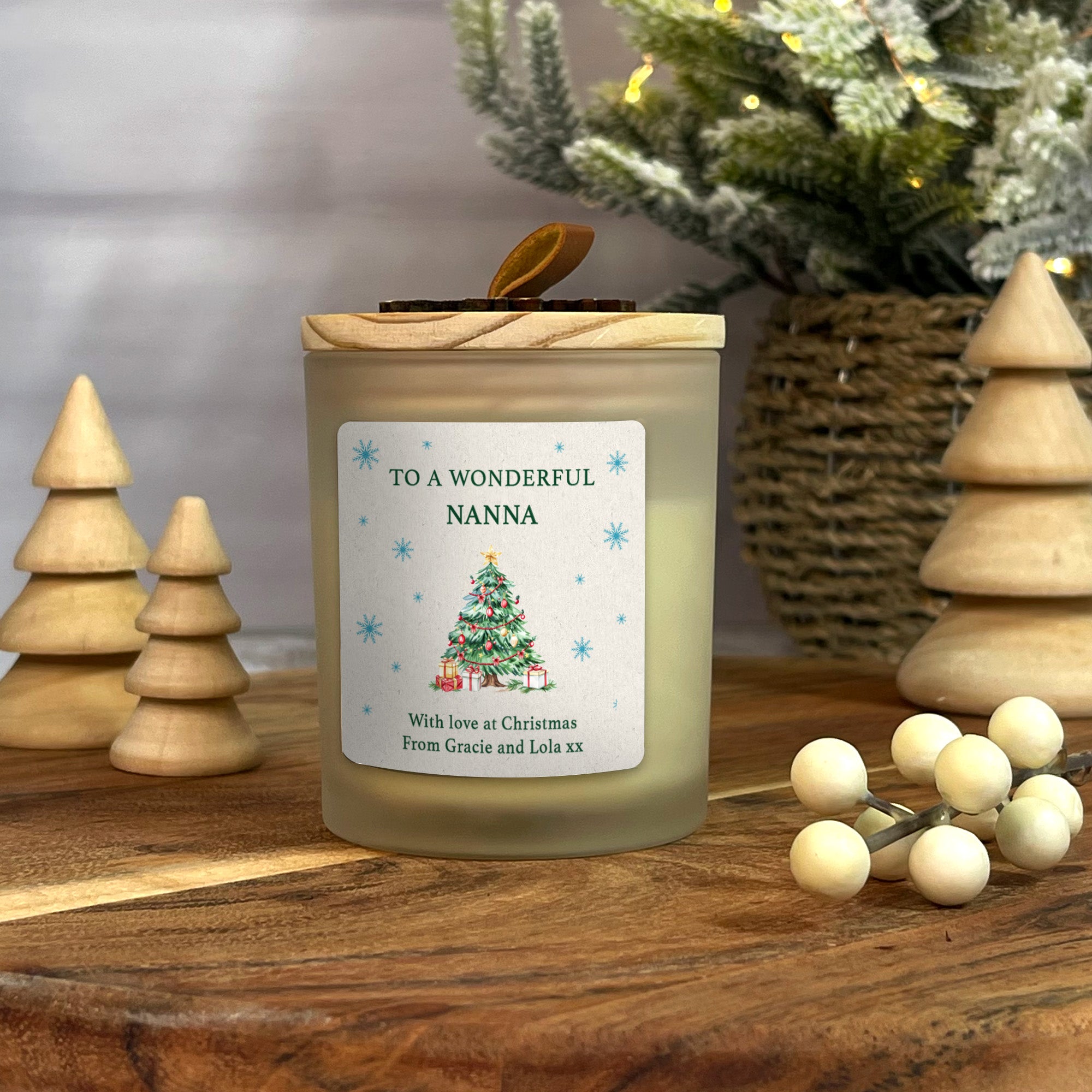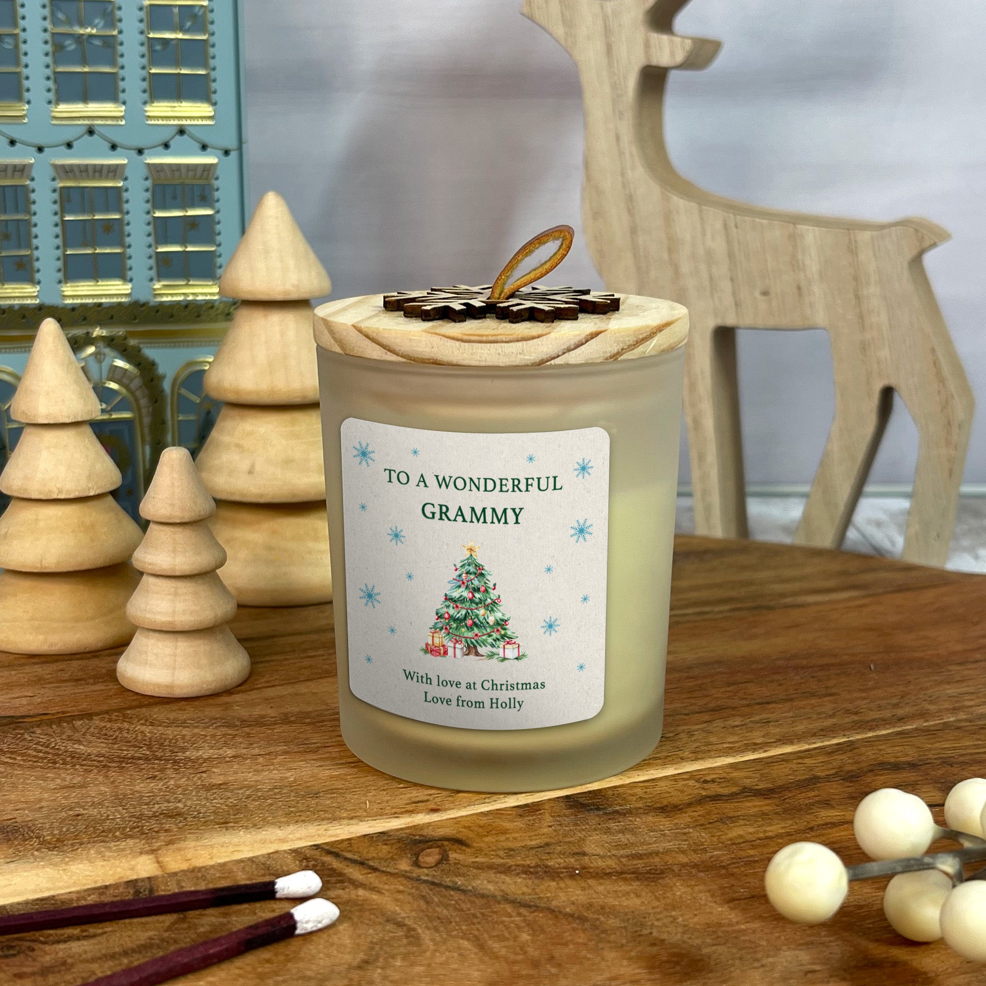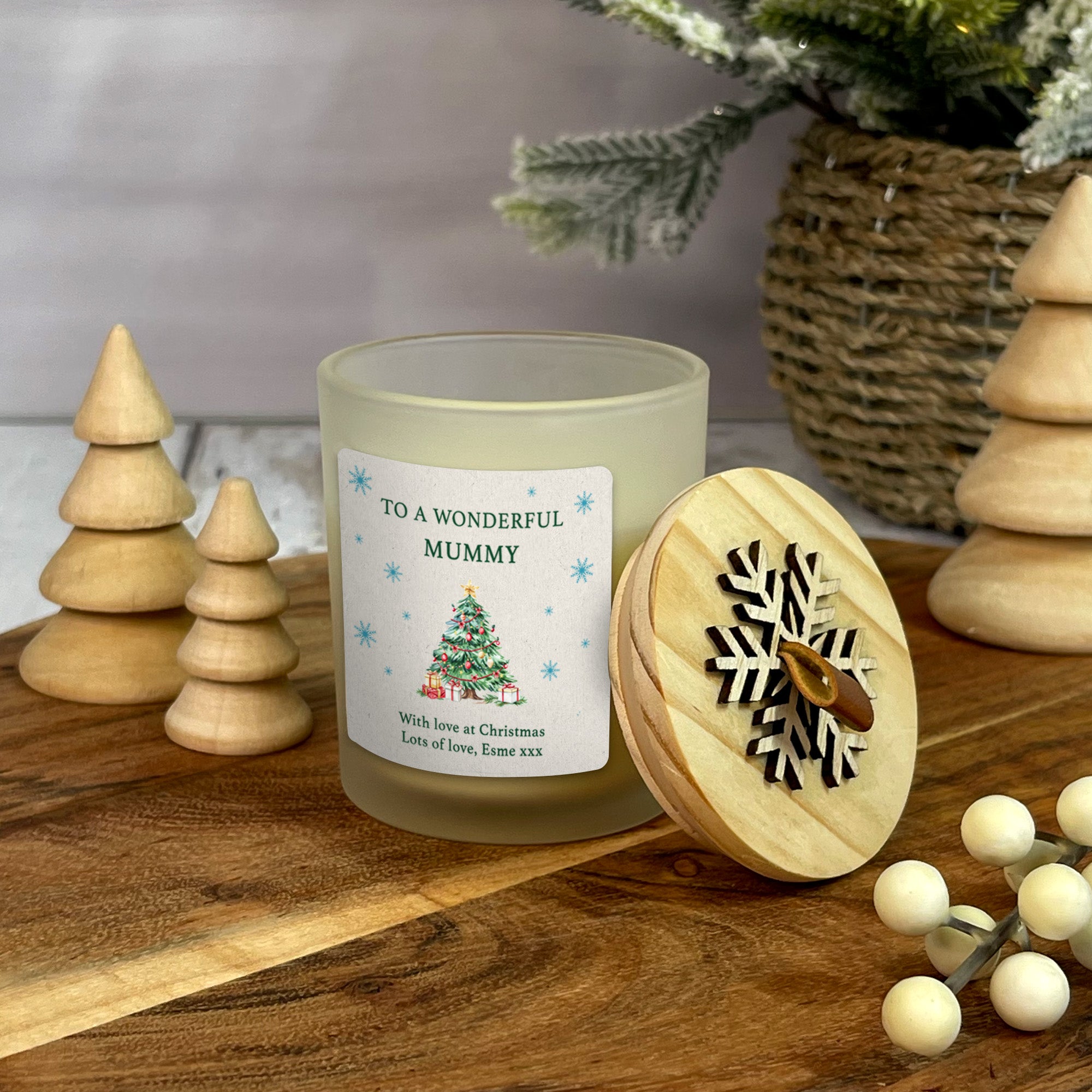 Personalised Christmas Tree Candle with Wooden Snowflake Lid