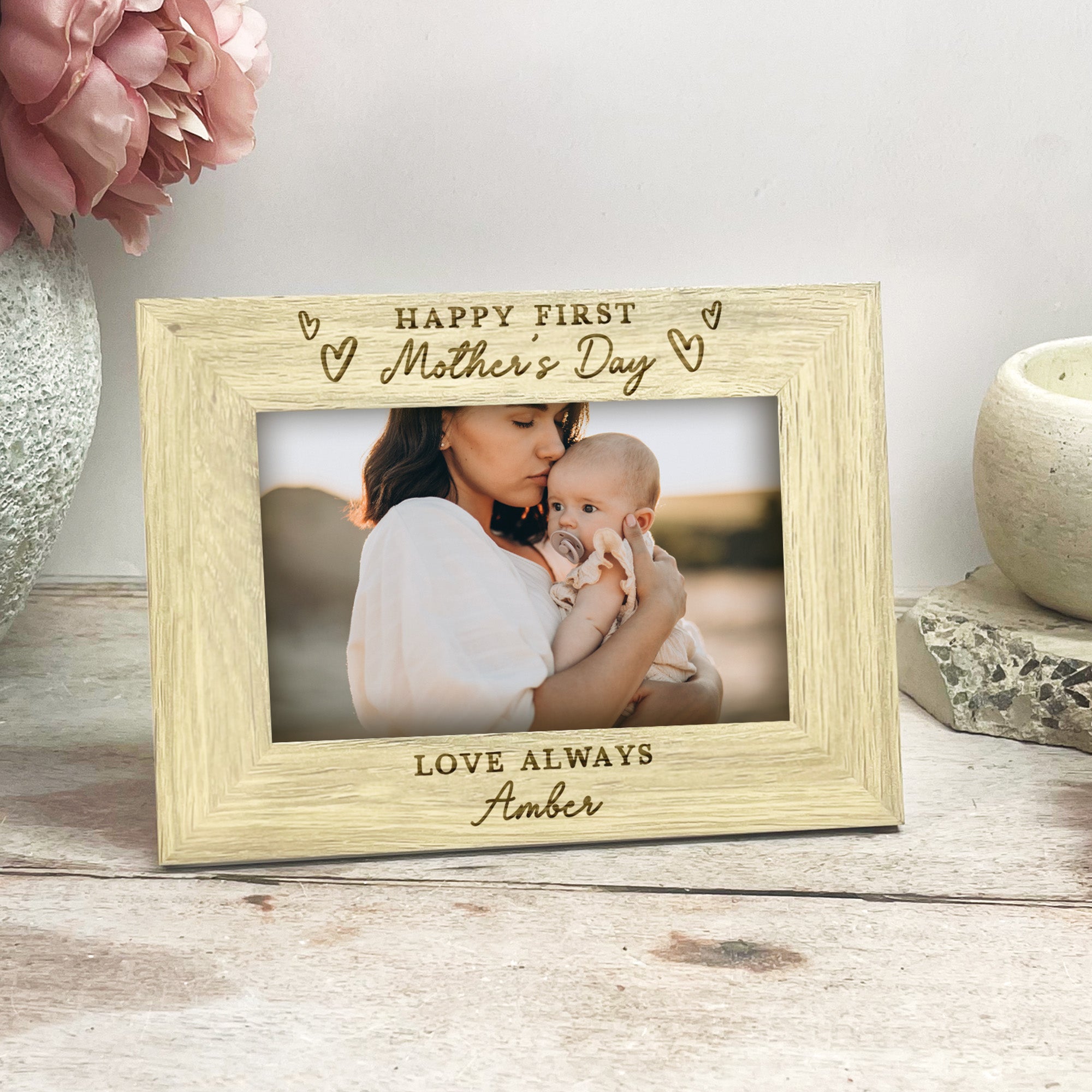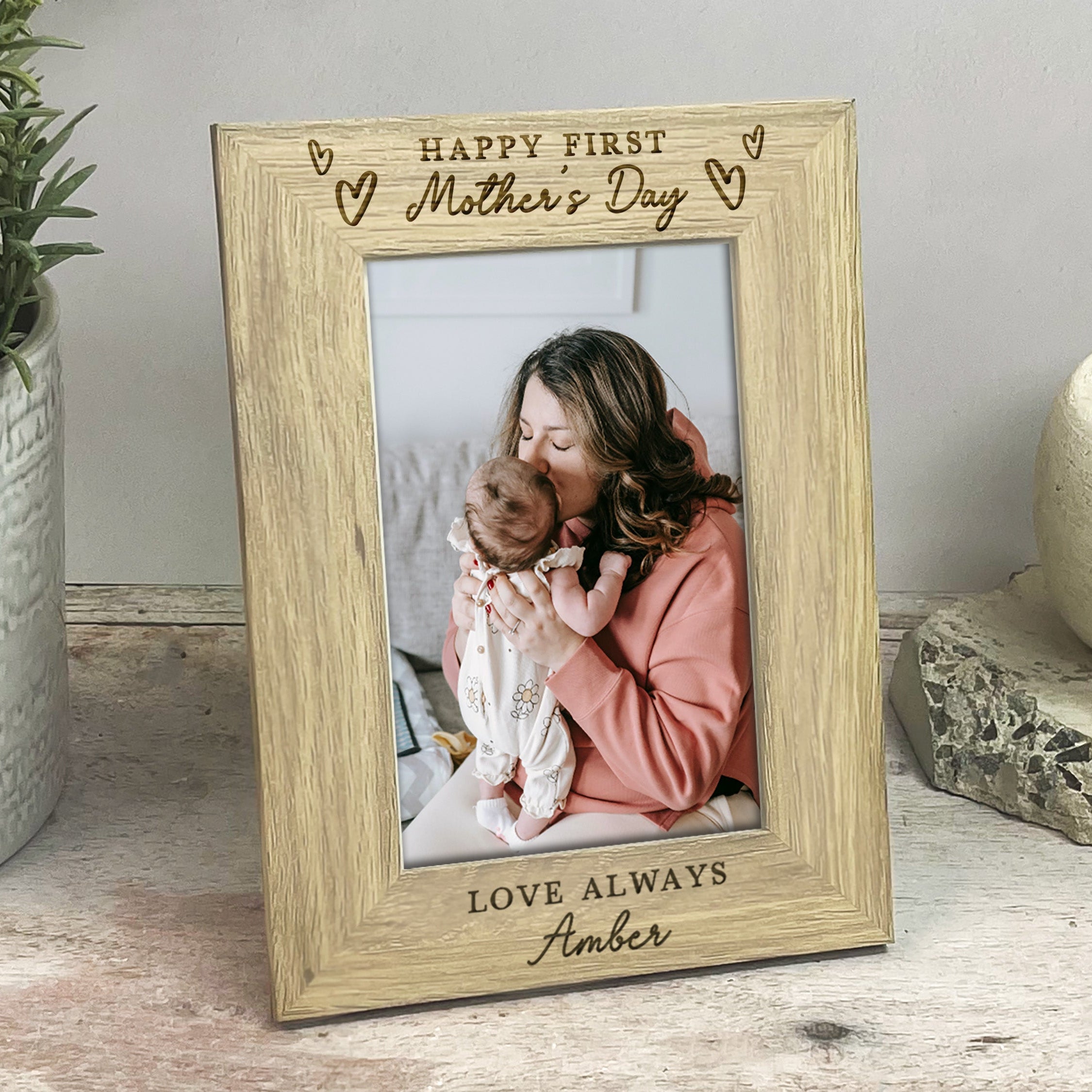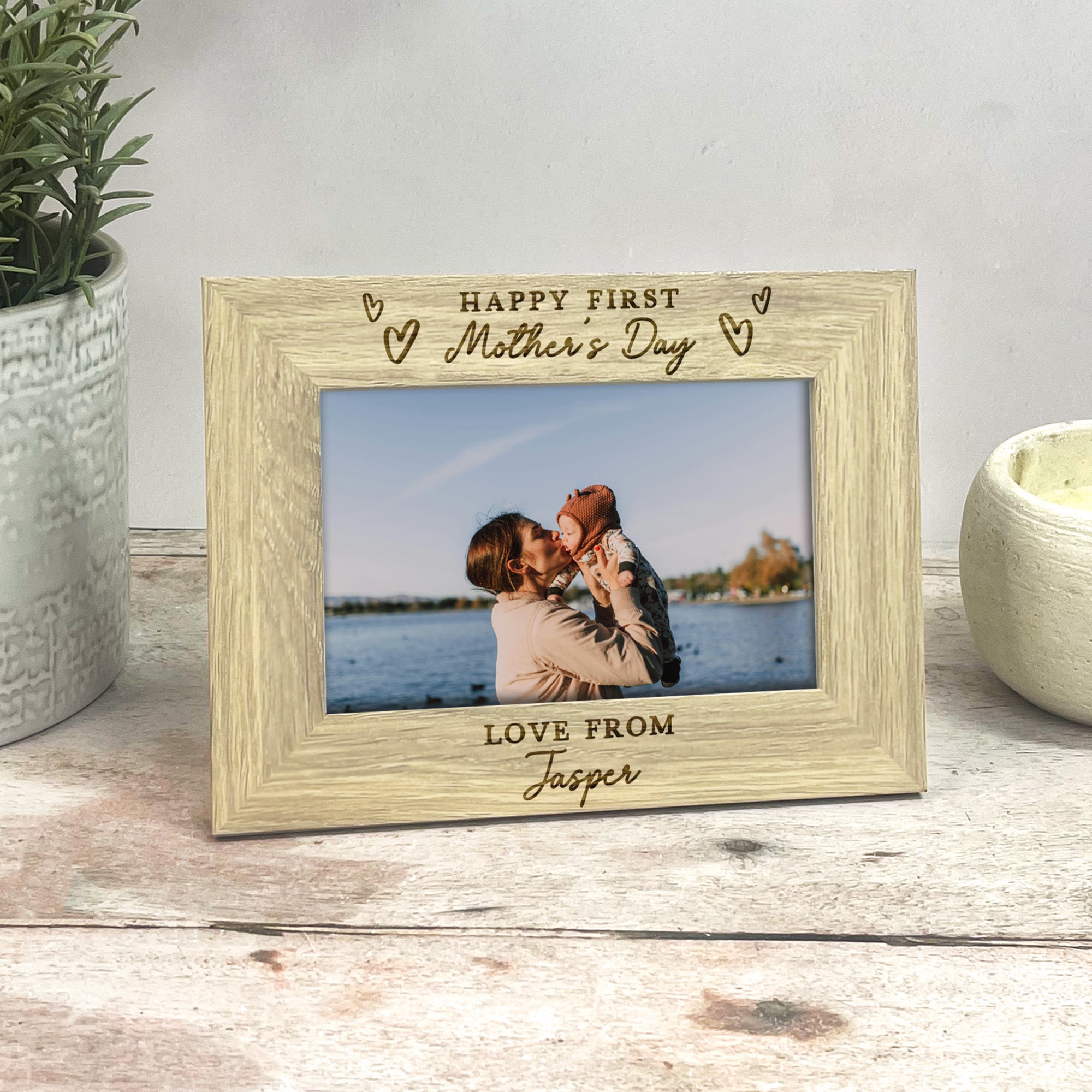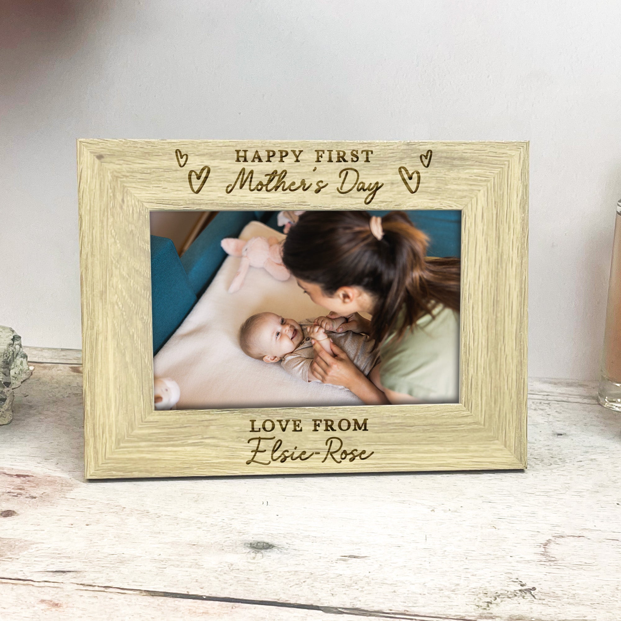 This beautiful wooden photo frame is engraved with the meaningful message “Happy First Mother’s Day”, surrounded by delicate love heart illustrations, making it the perfect keepsake for a new mum. The bottom of the frame is personalised with “Love from” followed by your baby’s name, creating a truly special and sentimental gift she’ll cherish for years to come.