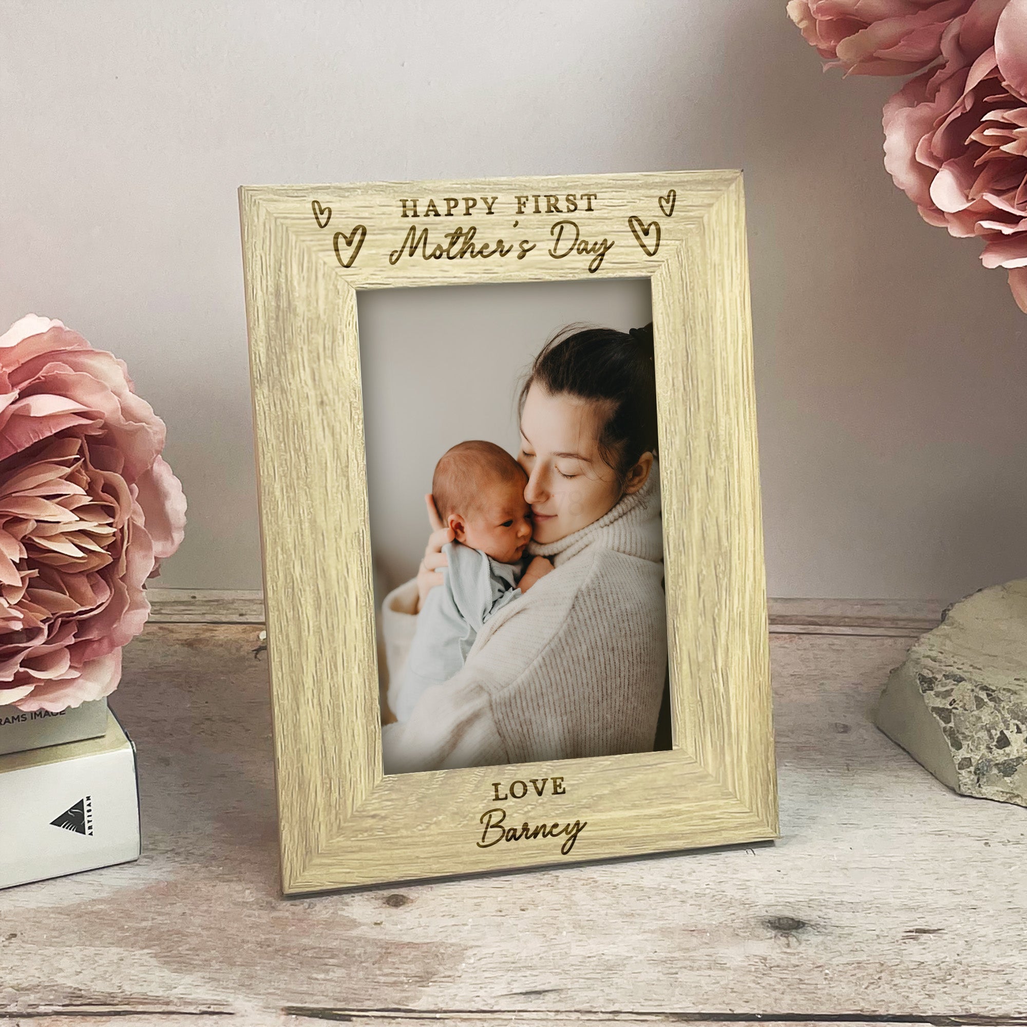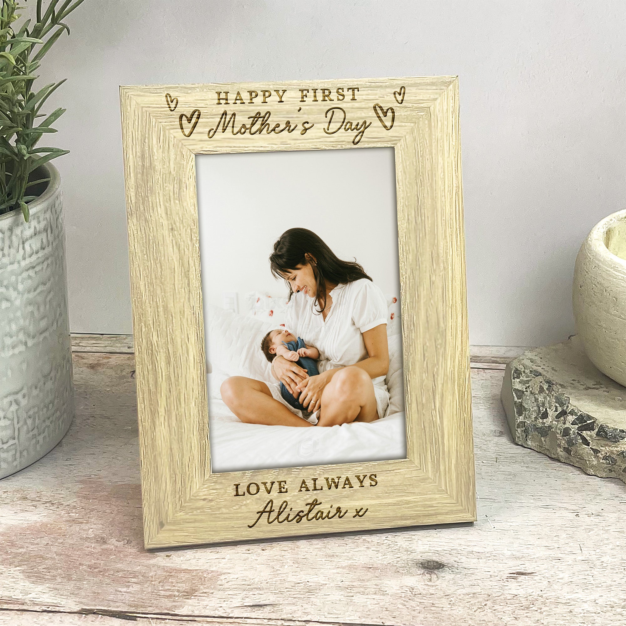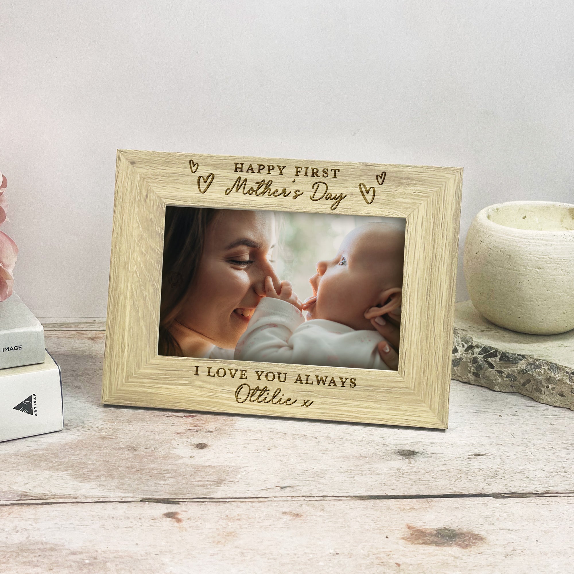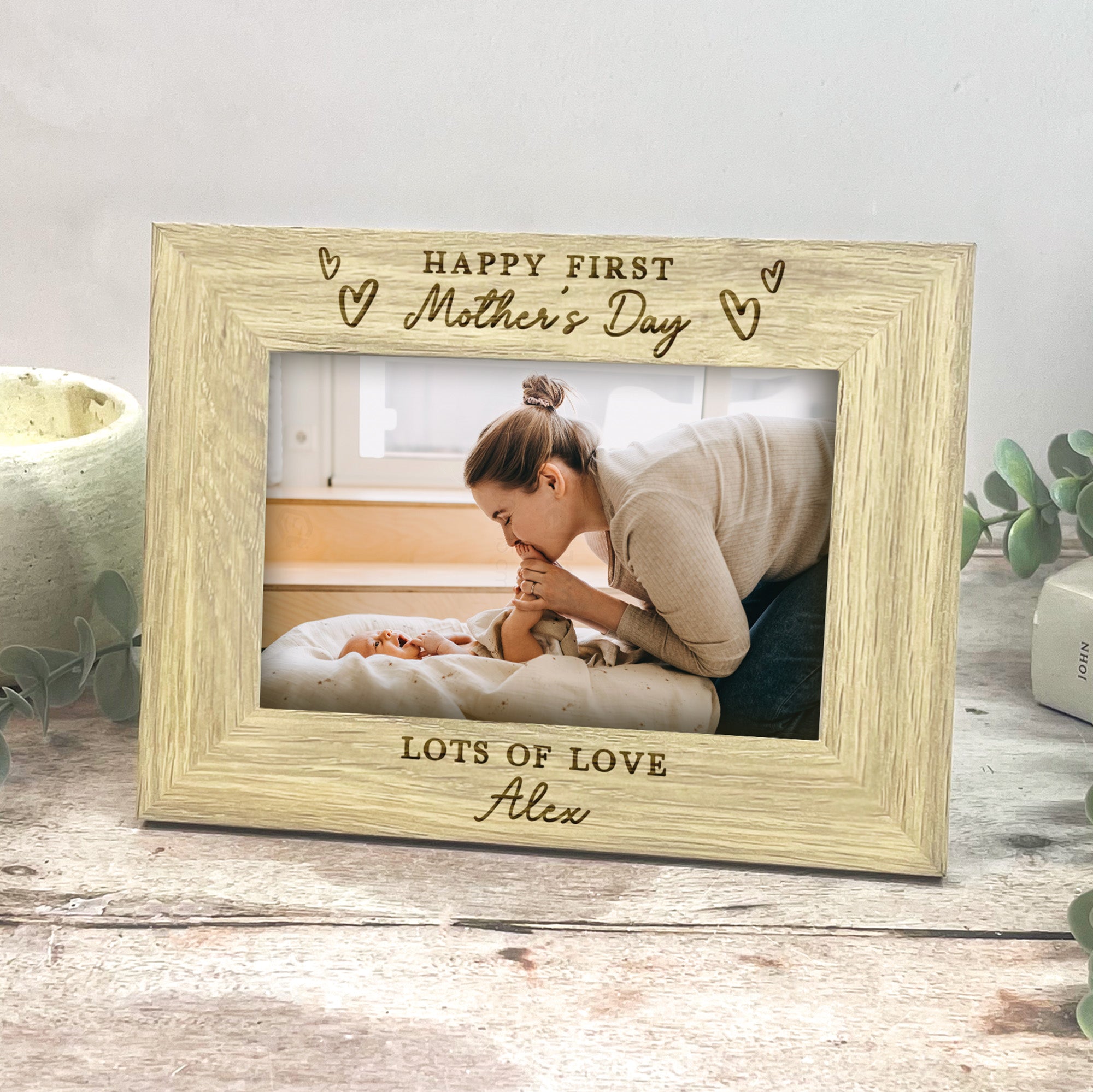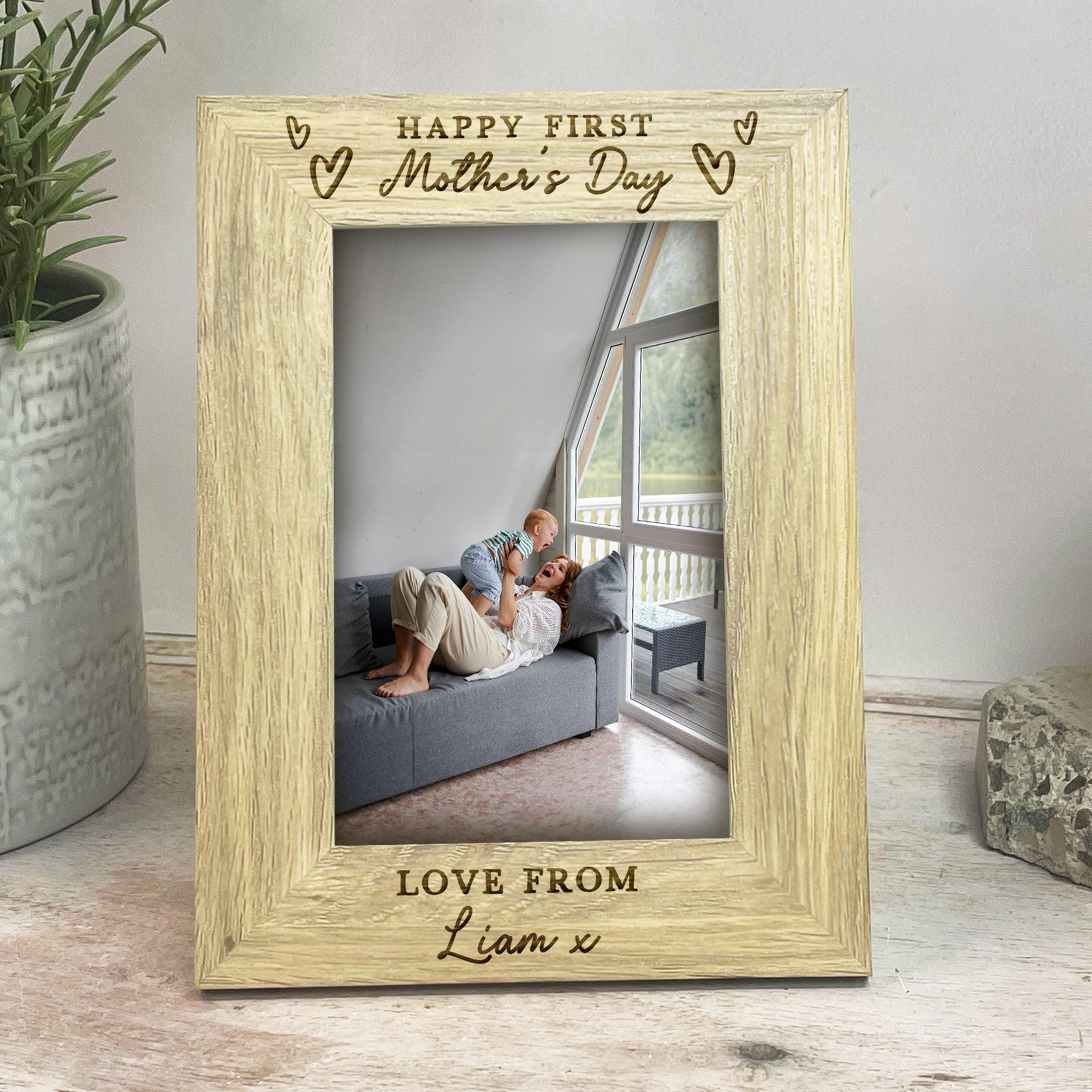 This beautiful wooden photo frame is engraved with the meaningful message “Happy First Mother’s Day”, surrounded by delicate love heart illustrations, making it the perfect keepsake for a new mum. The bottom of the frame is personalised with “Love from” followed by your baby’s name, creating a truly special and sentimental gift she’ll cherish for years to come.
