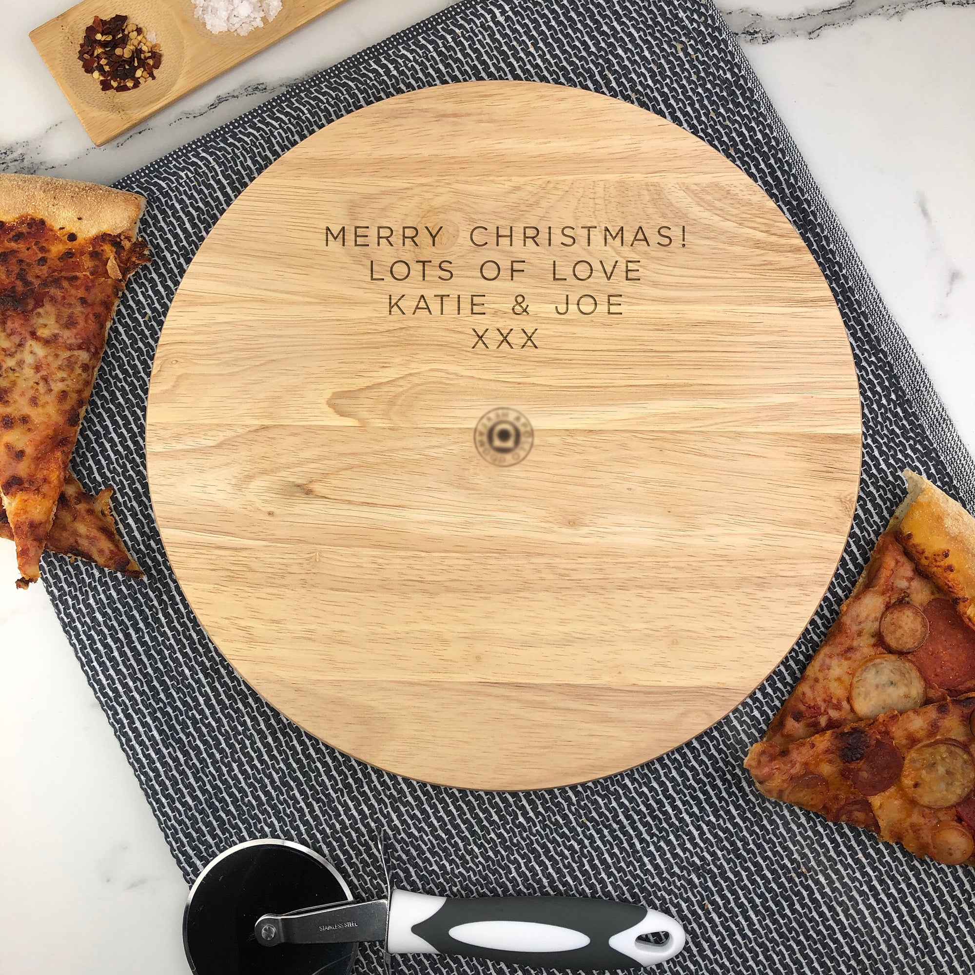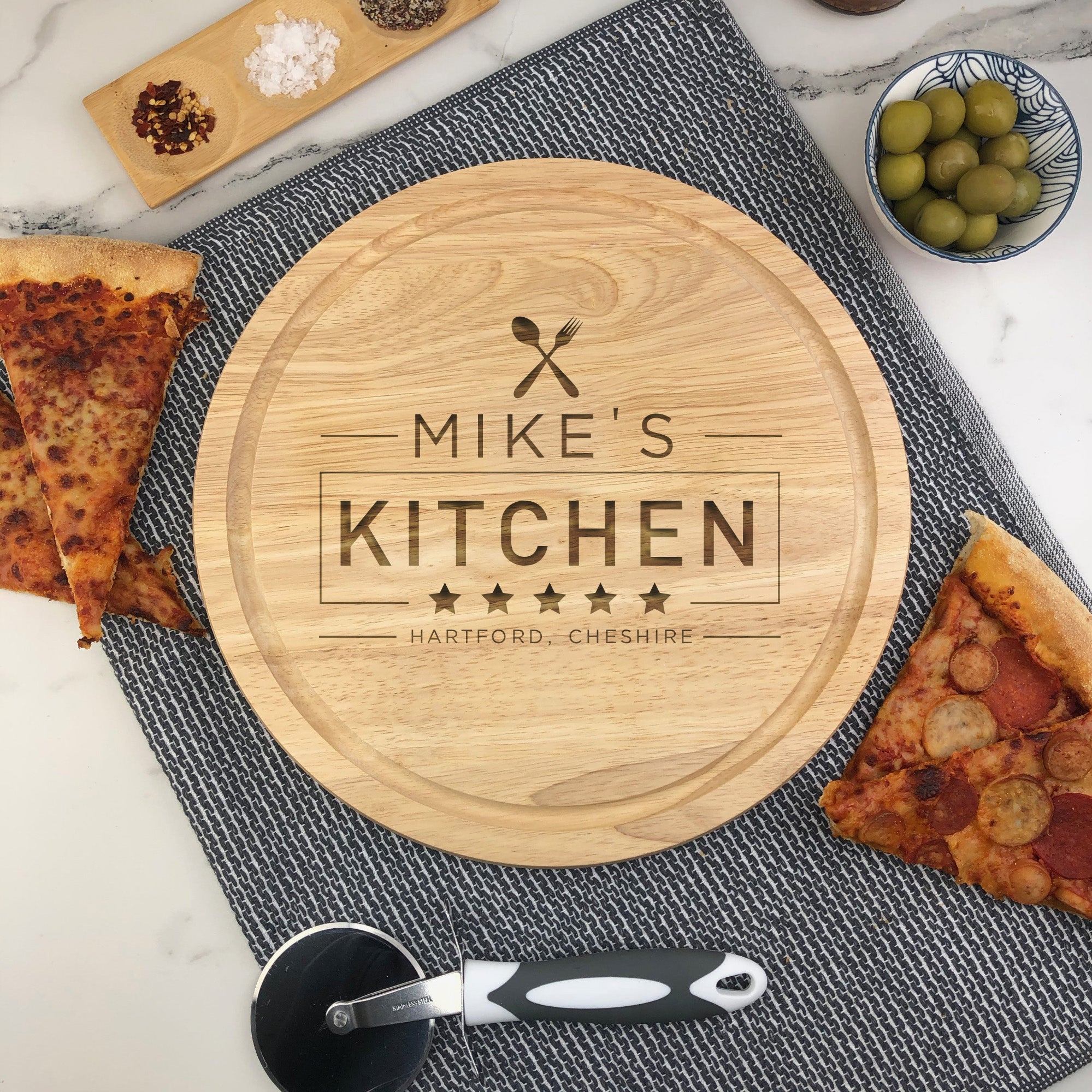 Expertly crafted from quality wood, this round chopping board features a modern five-star kitchen design, personalised just for you. Add any name to the top line (for example Steve’s Kitchen), and personalise the bottom line with a village/town and county (such as Kelsall, Cheshire) to give it a bespoke, restaurant-style finish.