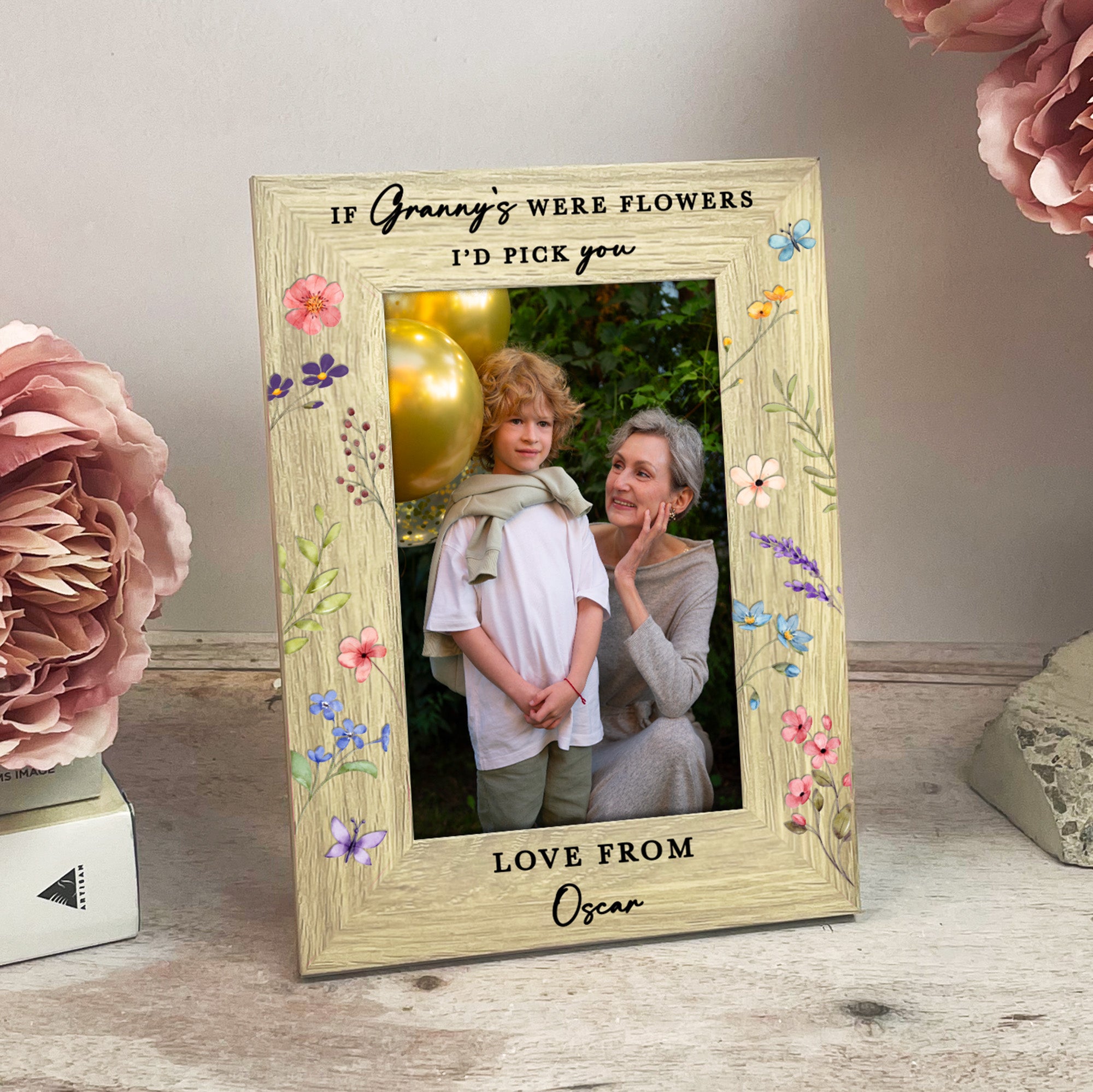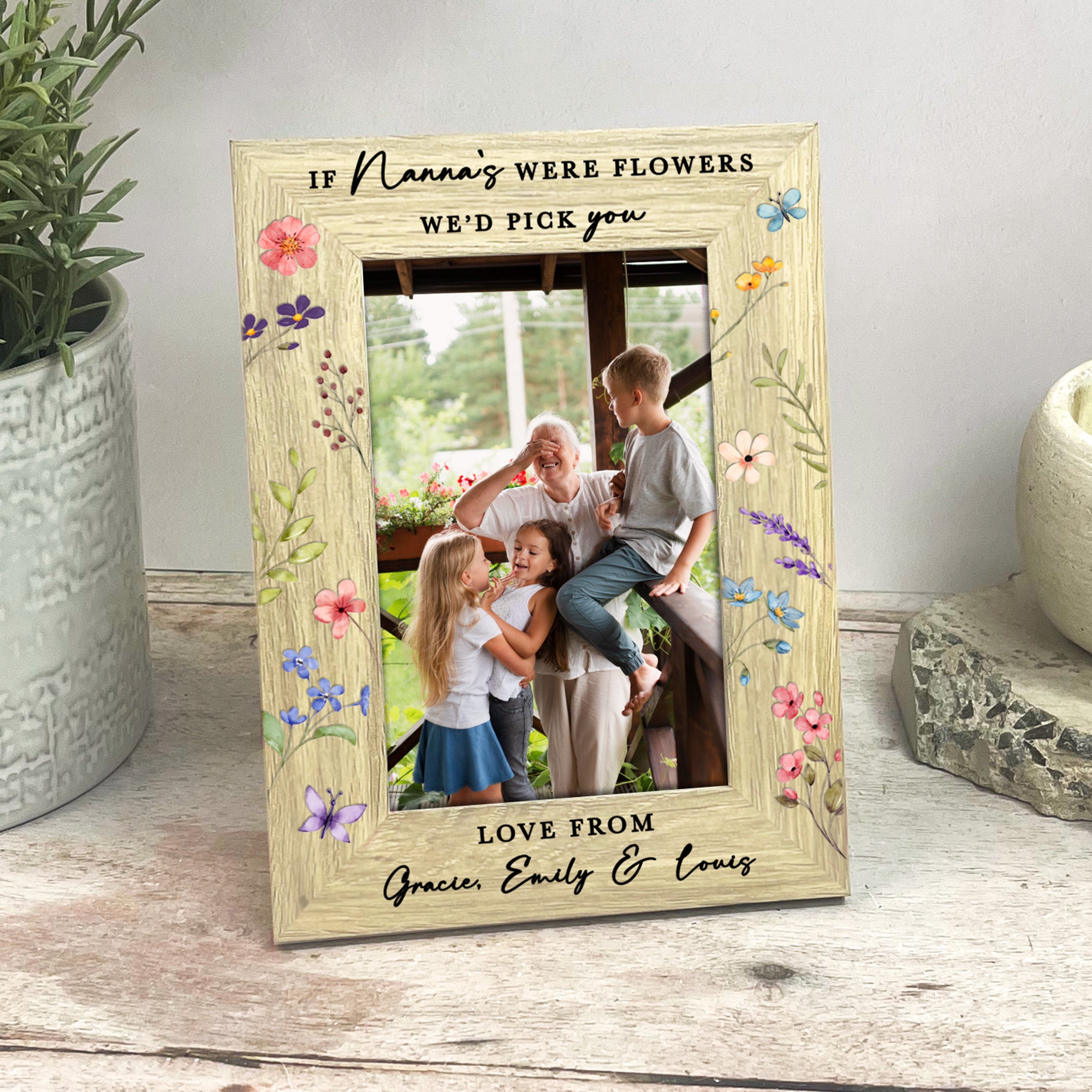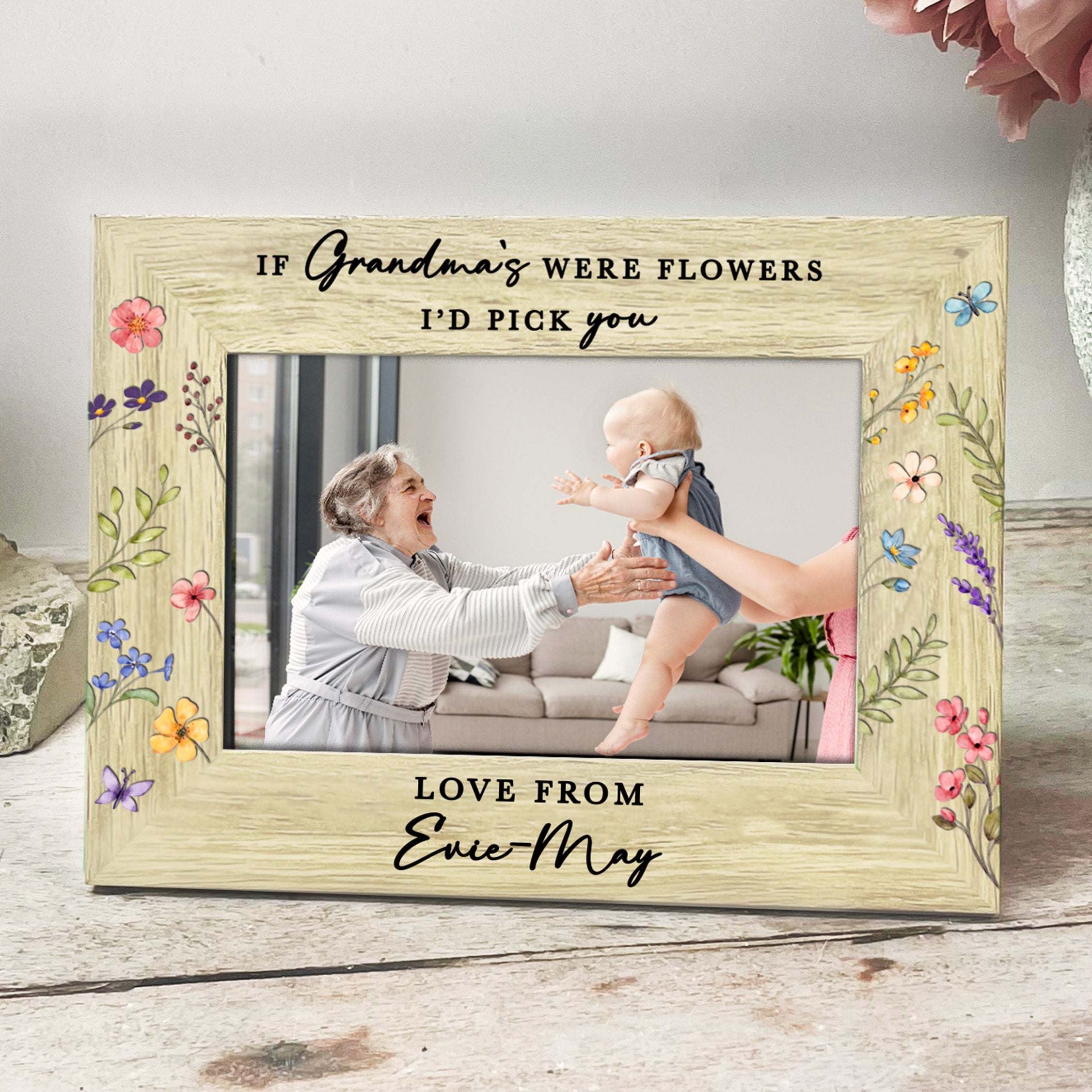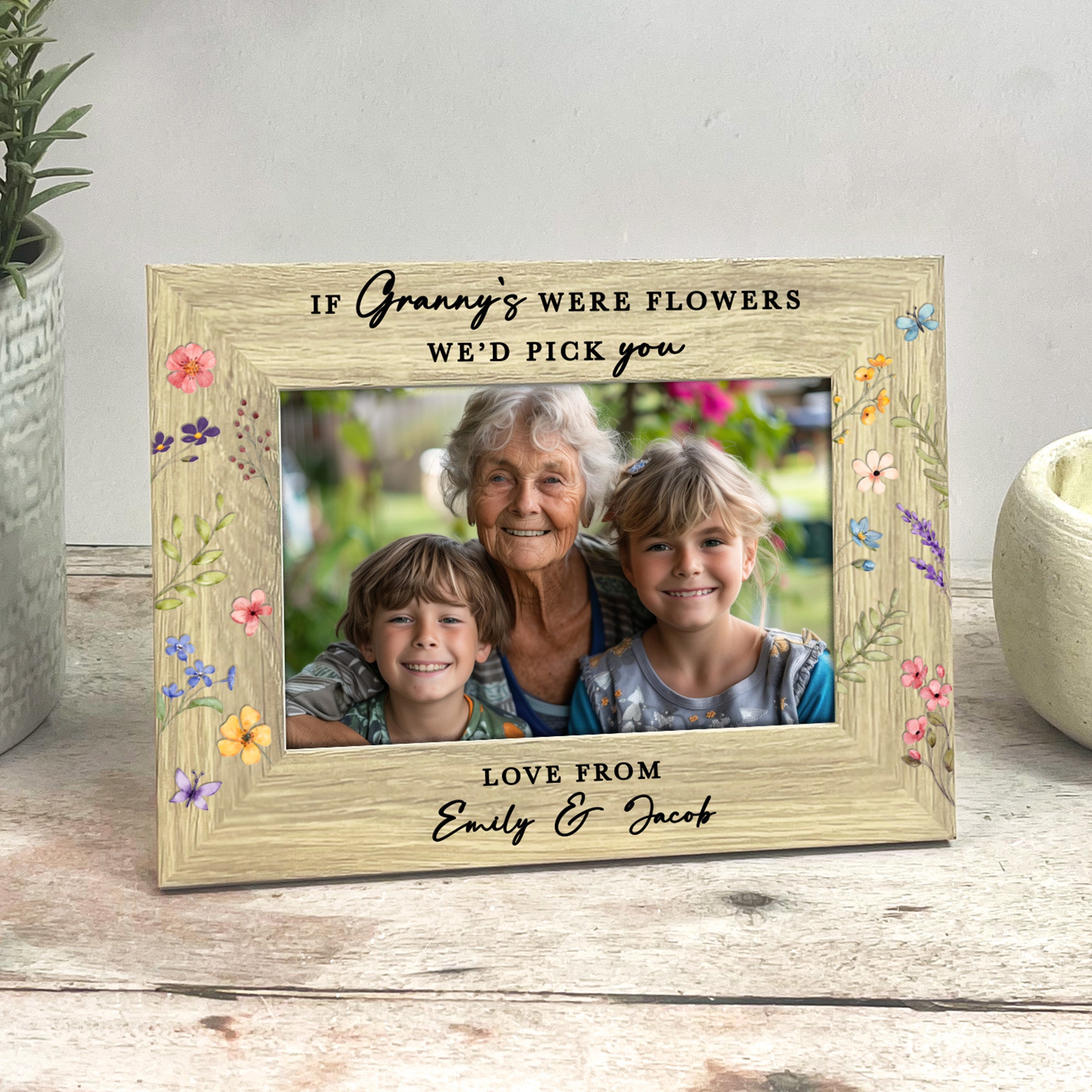 The top of the frame is printed with the touching quote “If Grandma’s were flowers, I/We’d pick you”, which can be fully personalised to suit your family. Choose from alternative names such as Granny, Nana, Nanny, Nonna or any special title you use, and we’ll adapt the wording to “I” or “We” depending on how many grandchildren the gift is from.