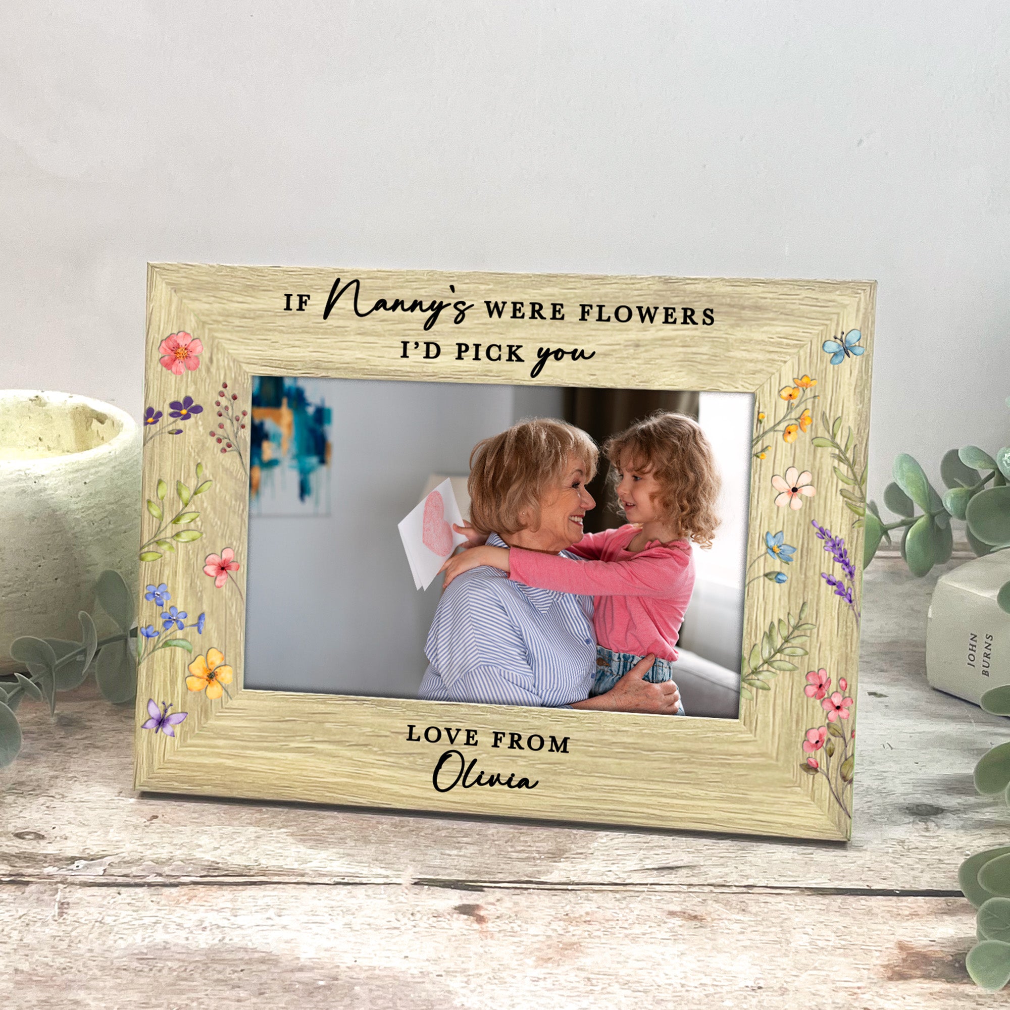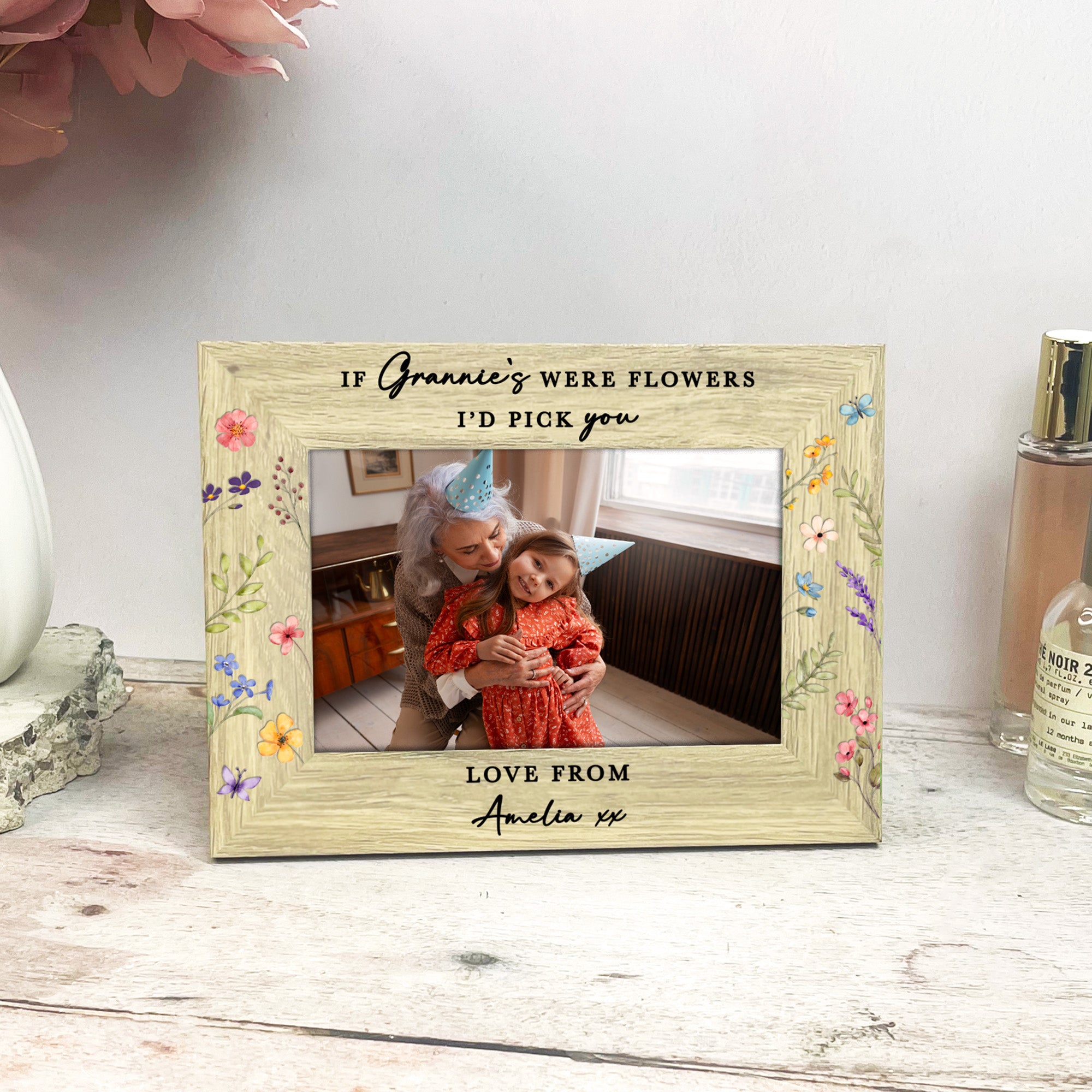 Delicate, colourful floral detailing surrounds the frame, adding a soft and joyful touch that makes this gift feel extra special. Along the bottom, the frame is printed with “Love from” followed by the name or names of her grandchild or grandchildren, creating a truly personal finish.