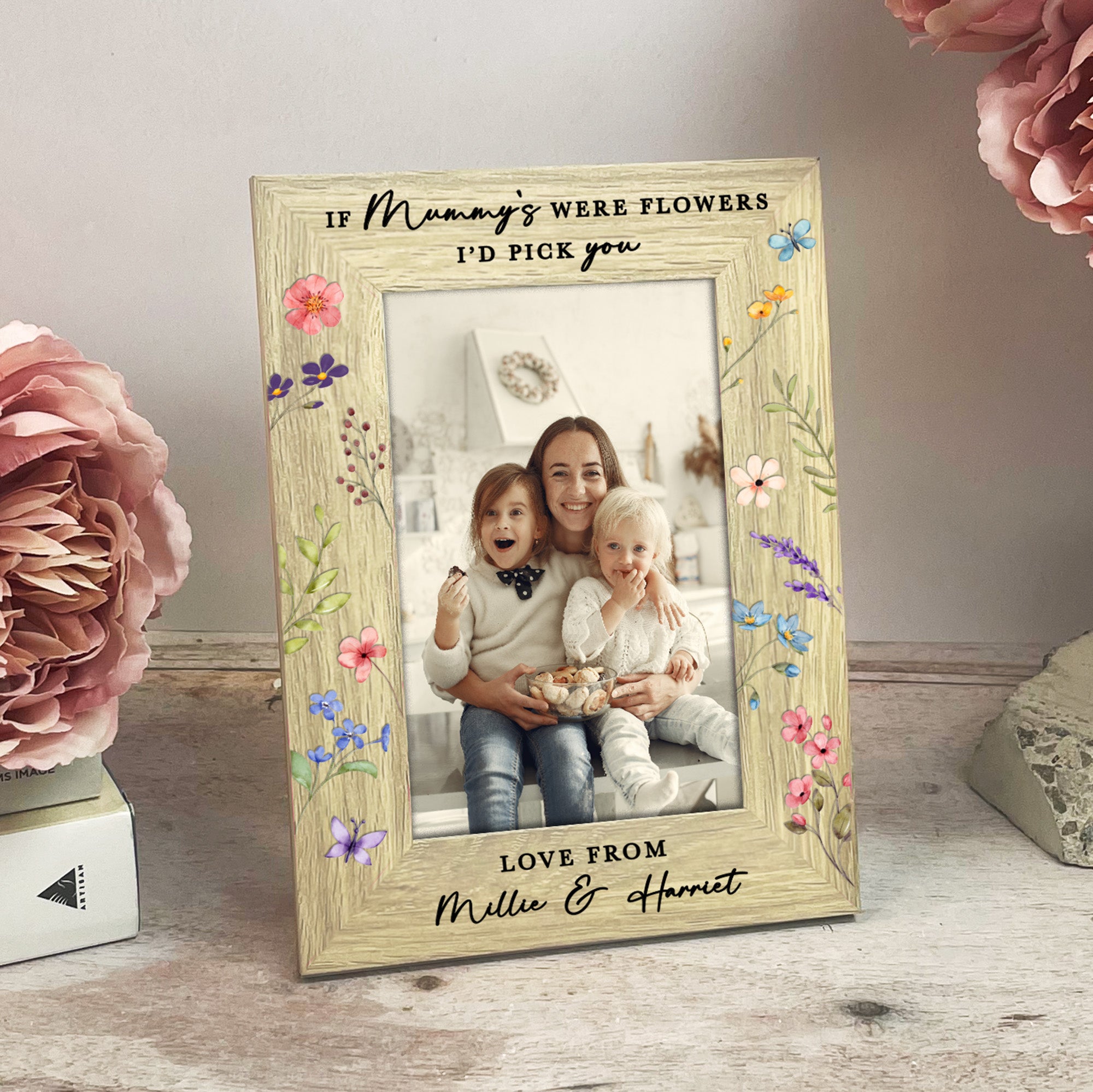 The frame is finished with delicate, colourful floral detailing, adding a soft, elegant touch that makes it perfect for Mother’s Day, birthdays, or as a meaningful gift for a new mum. Along the bottom, it is personalised with “Love from” followed by the name or names of her child or children, making it truly one of a kind.