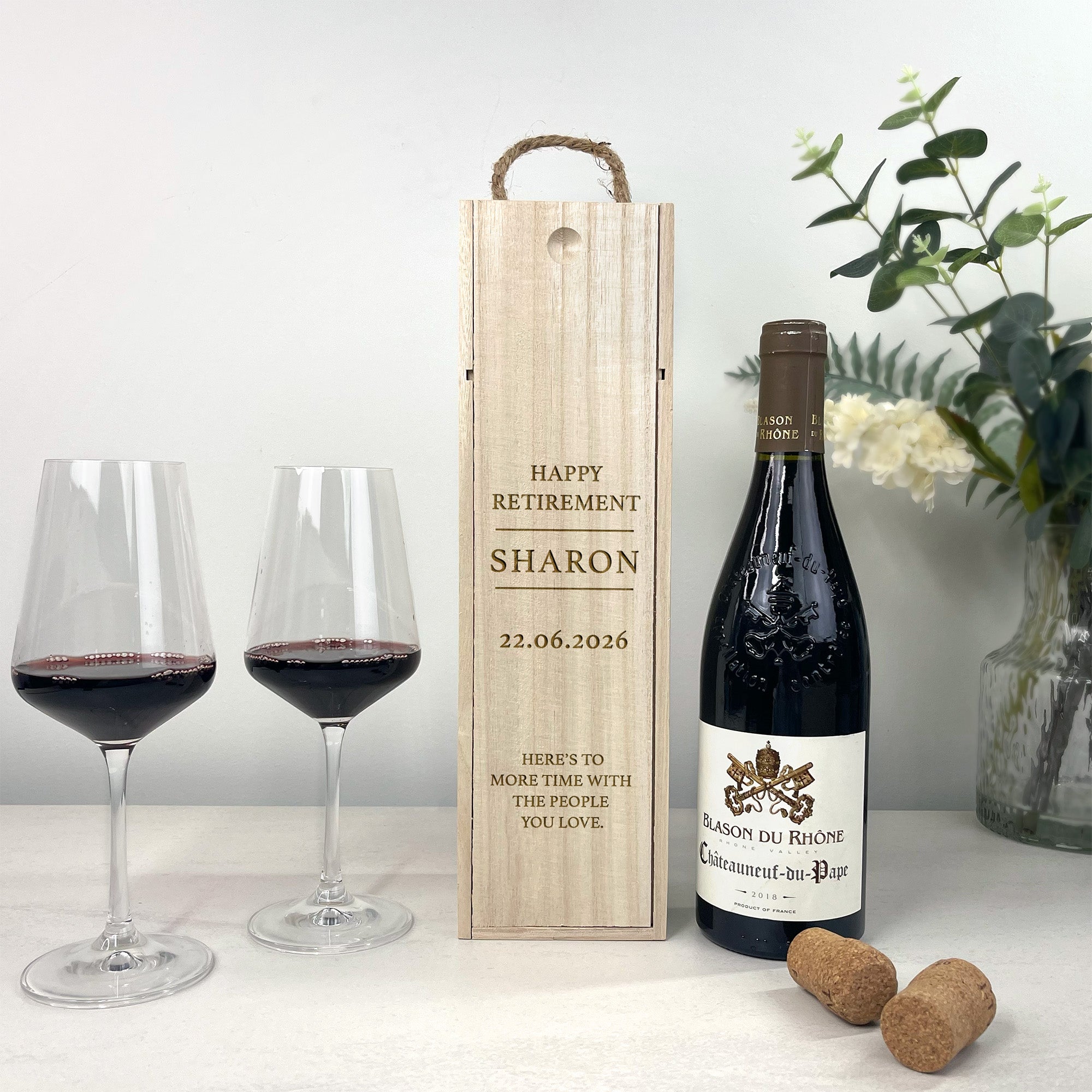 Crafted from natural wood and finished with a sturdy rope handle, this elegant bottle box is laser engraved with “Happy Retirement”, the recipient’s name, a special date, and your own personalised message, creating a meaningful memento they’ll treasure long after the bottle has been enjoyed.