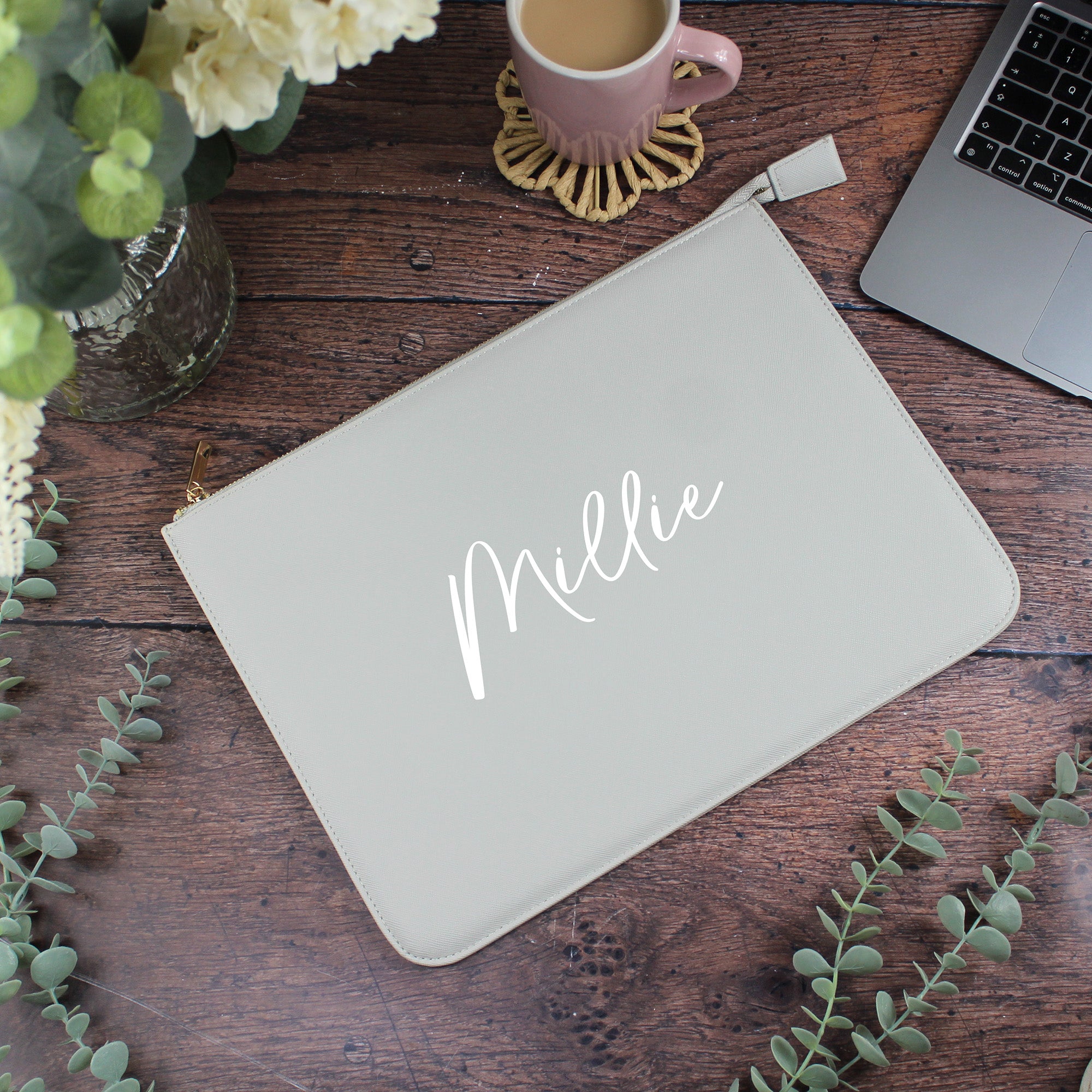 Available in classic Black, Oyster, and Soft Grey, each case is finished with a high-shine gold metal zip and a soft-touch lining to keep your laptop safe and scratch-free. Designed to comfortably fit an 11” laptop or A4 folder, this zipped case is both versatile and stylish, working perfectly as a laptop cover, document holder, or clutch-style organiser.