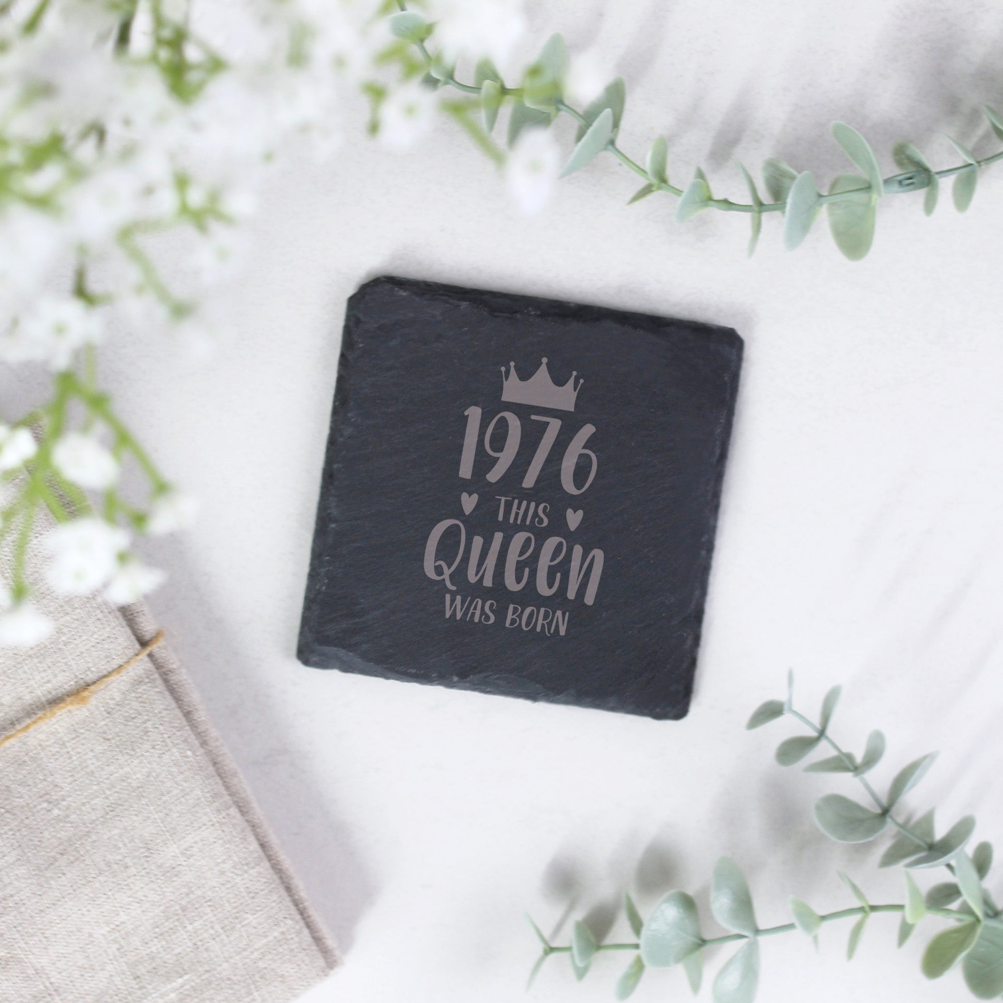 Measuring 10.5 x 0.5 x 10.5 cm, it is made from high-quality natural slate, which showcases its organic texture and durability. The coaster is engraved with the words "1976 This Queen was Born" making it a meaningful tribute to a remarkable year. Its bold yet elegant engraving ensures that the design stands out, adding a touch of sophistication to any setting.