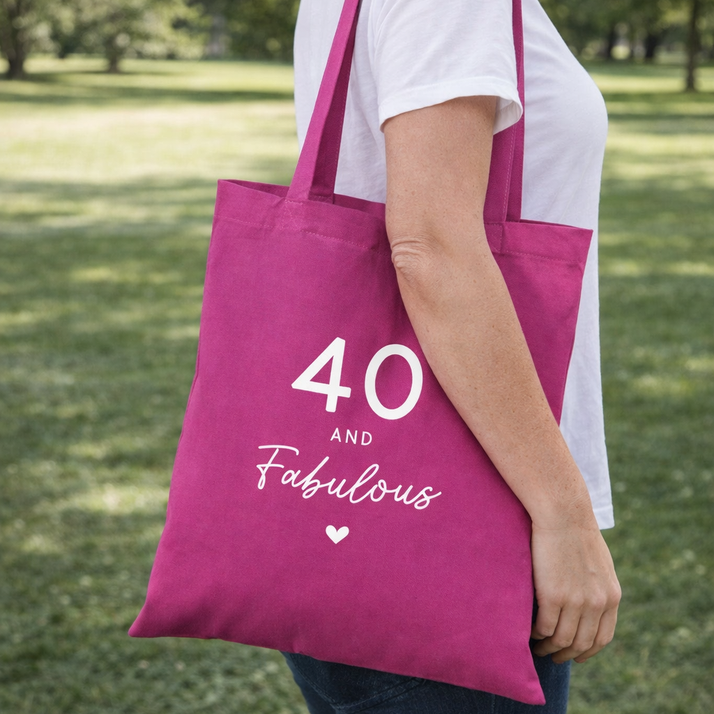 This 40 and Fabulous Pink Tote Bag is part of our Milestone Birthday Collection where the design "40 and Fabulous" can be personalised on the following products:
