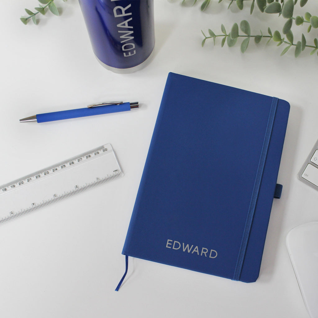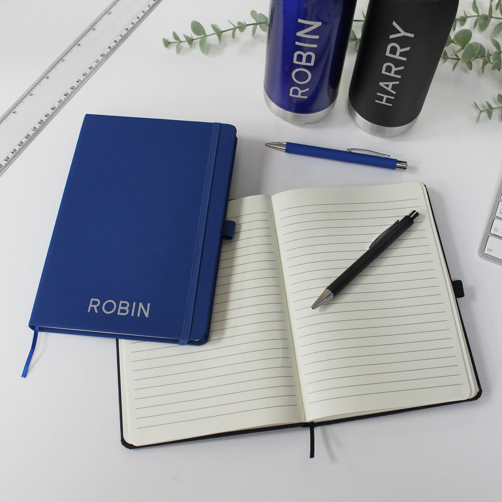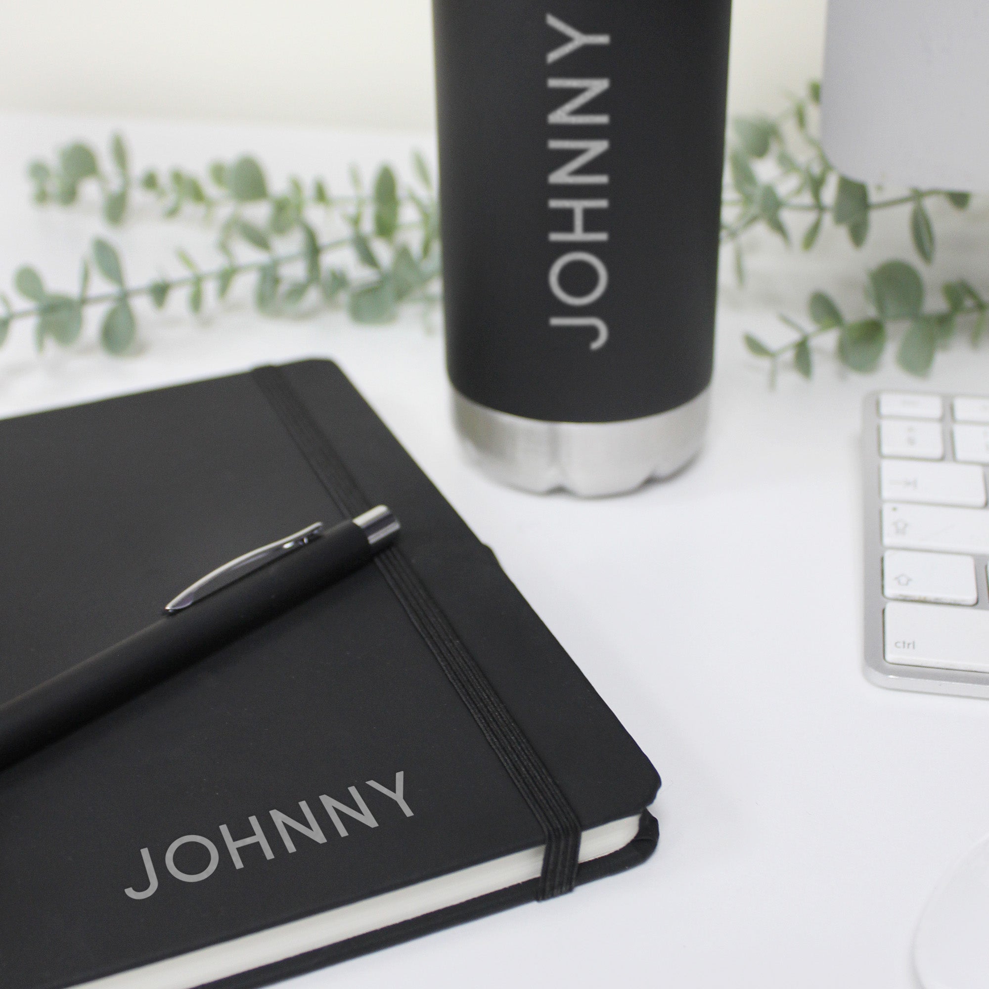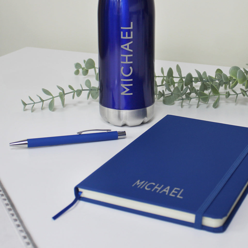 Why not complete this set, by adding a matching personalised double walled water bottle, with a high capacity of 500ml, this bottle is designed to keep you hydrated in style. With double-wall vacuum technology, this bottle will keep your drinks ice-cold for up to 24 hours, regardless of the outside temperature. Alongside keeping your drinks cold, it also keeps your tea or coffee hot for up to 12 hours, which is perfect for those cold morning commutes. The vibrant blue bottle boasts a glossy finish that adds a splash of colour, while the black bottle offers a matte finish for a sophisticated, understated look. Each bottle is meticulously engraved to match the notebook, bringing the set together beautifully.