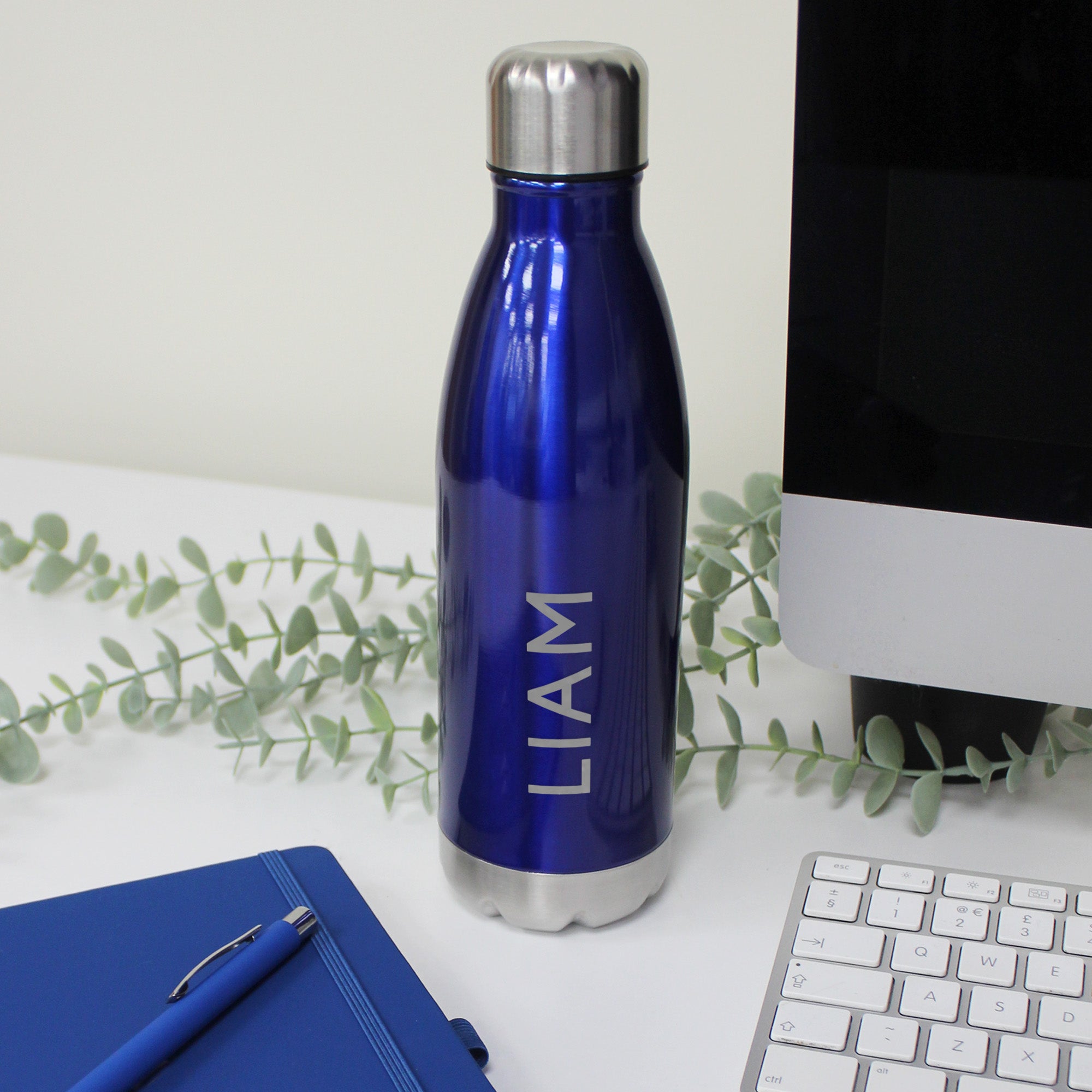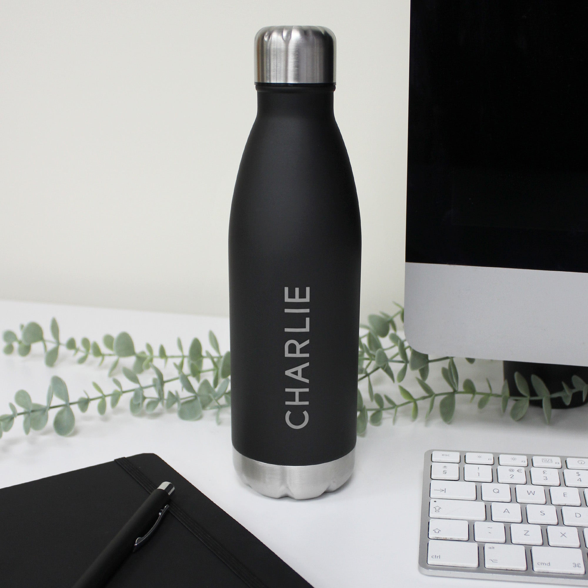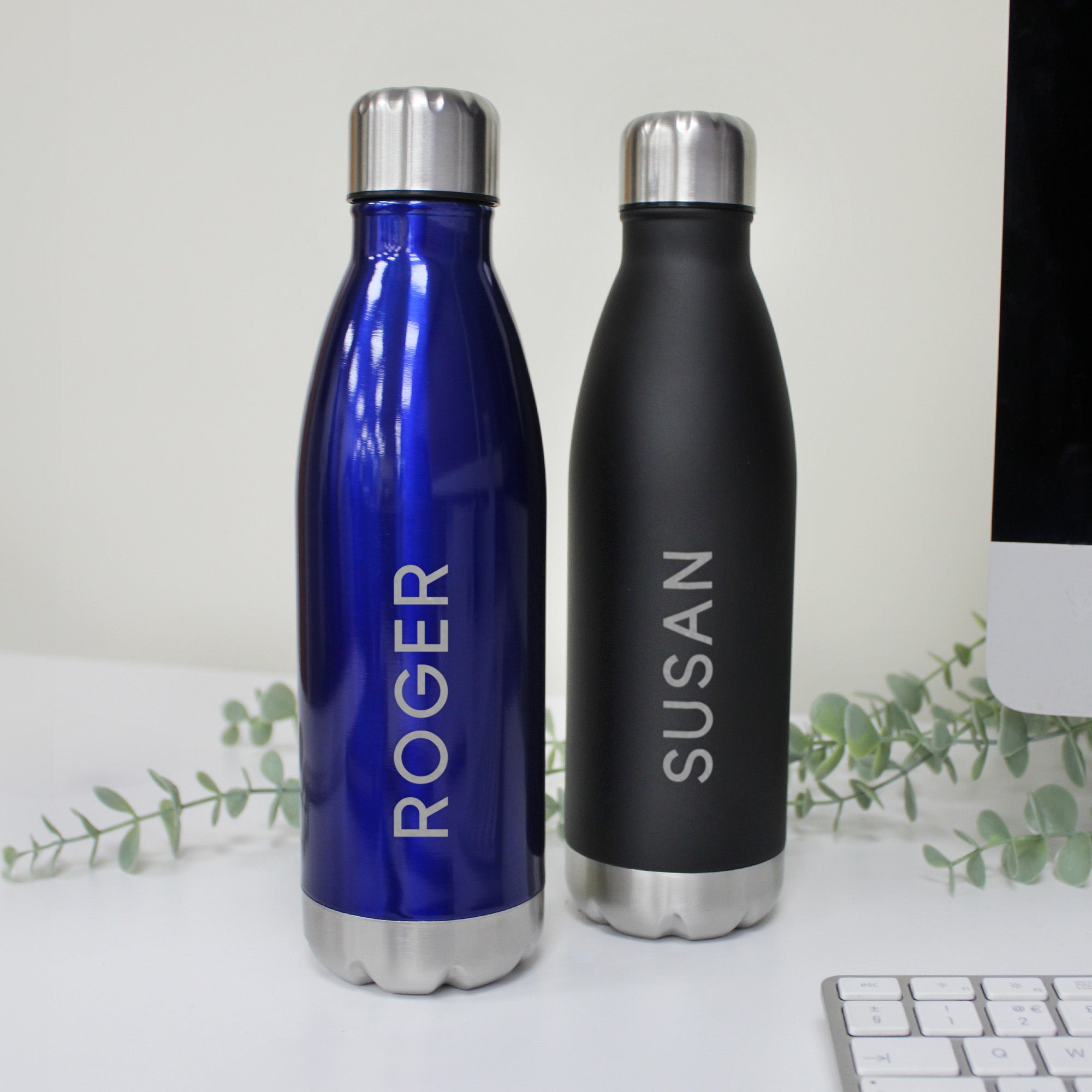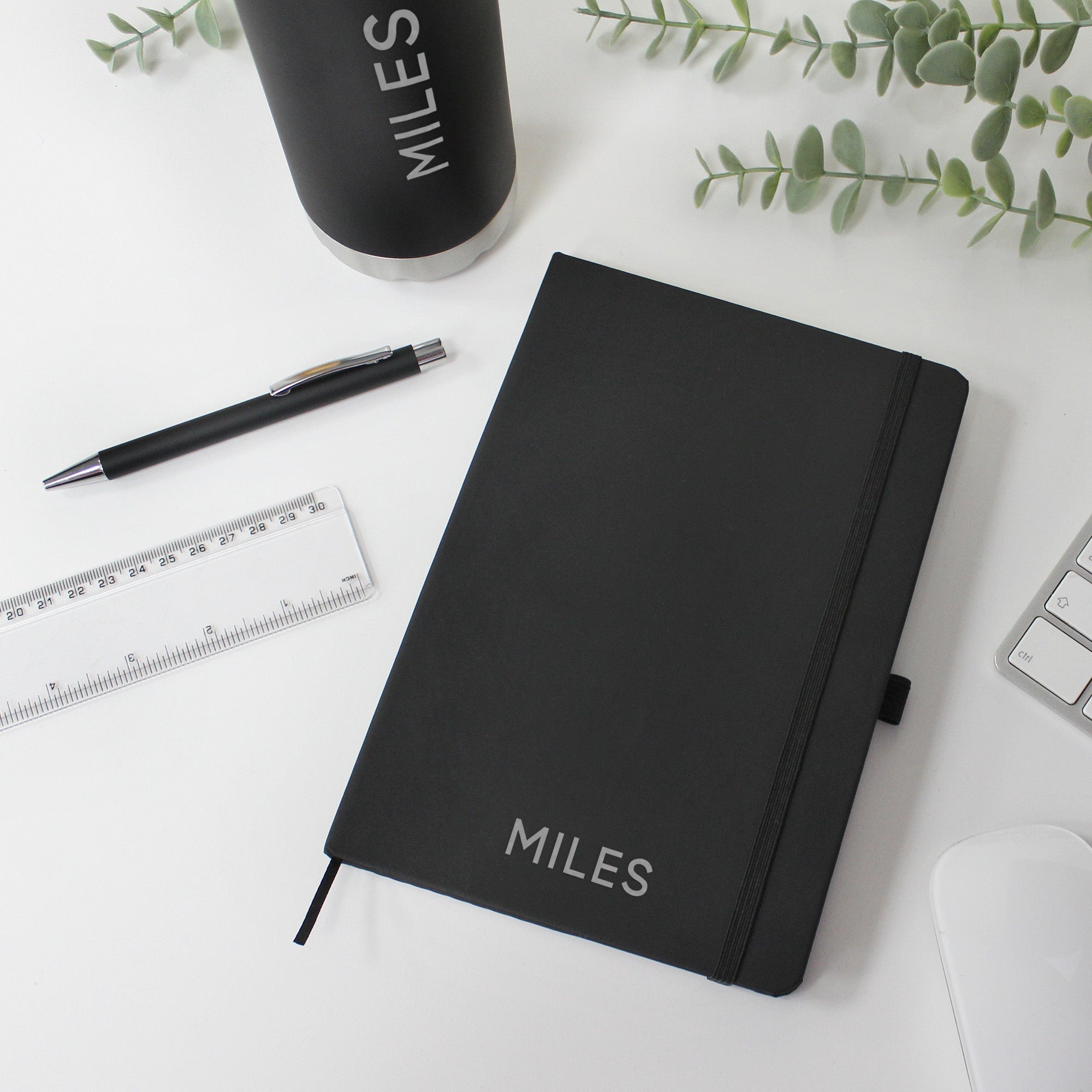 Why not complete this set, by adding a matching personalised double walled water bottle, with a high capacity of 500ml, this bottle is designed to keep you hydrated in style. With double-wall vacuum technology, this bottle will keep your drinks ice-cold for up to 24 hours, regardless of the outside temperature. Alongside keeping your drinks cold, it also keeps your tea or coffee hot for up to 12 hours, which is perfect for those cold morning commutes. The vibrant blue bottle boasts a glossy finish that adds a splash of colour, while the black bottle offers a matte finish for a sophisticated, understated look. Each bottle is meticulously engraved to match the notebook, bringing the set together beautifully.