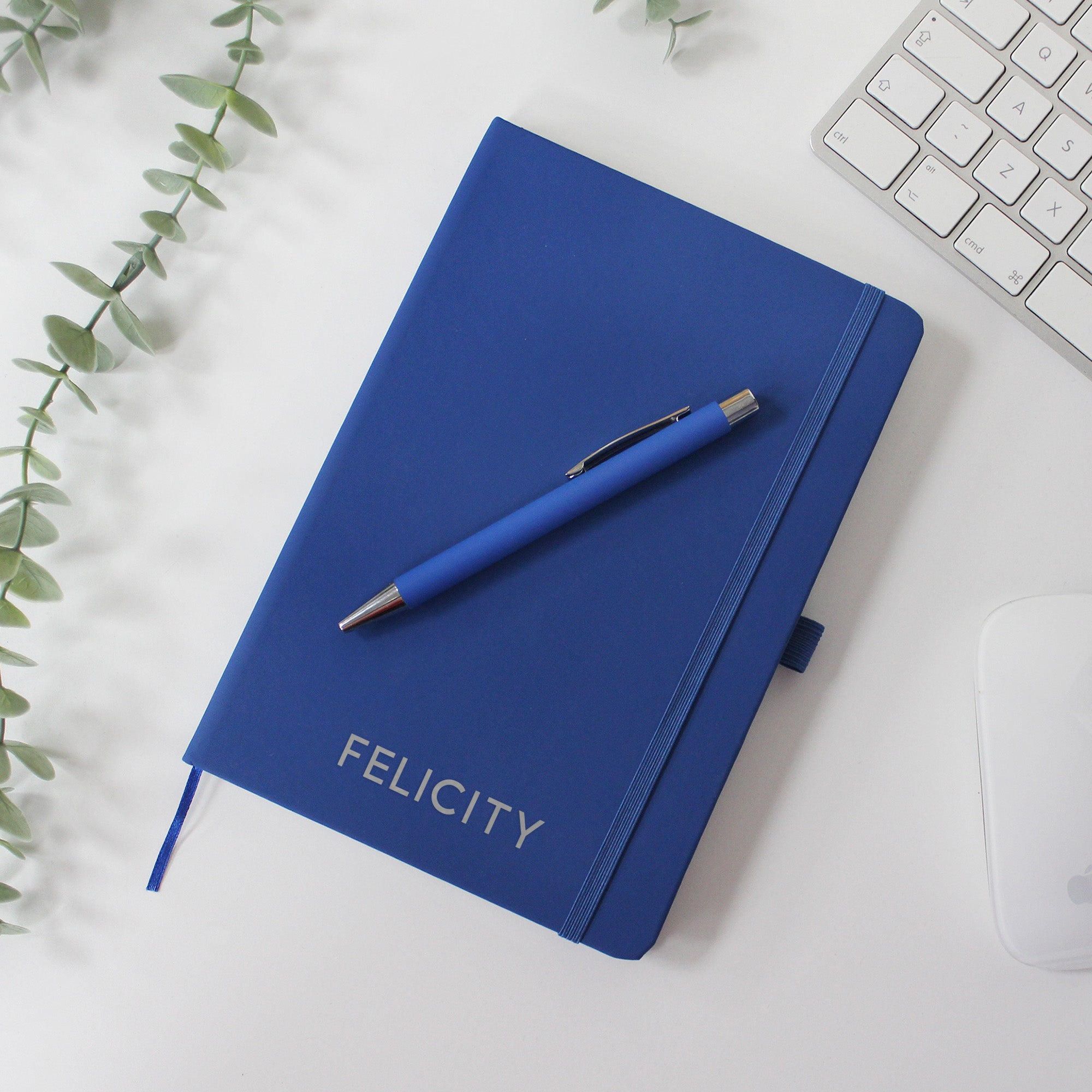 At the heart of the set is the Soft Touch Hardback Notebook, which includes a pen holder, bookmark and elastic band, and 100 inner lined pages. Featuring a durable, smooth PU leather cover that can be uniquely personalised with your name in premium silver vinyl lettering.