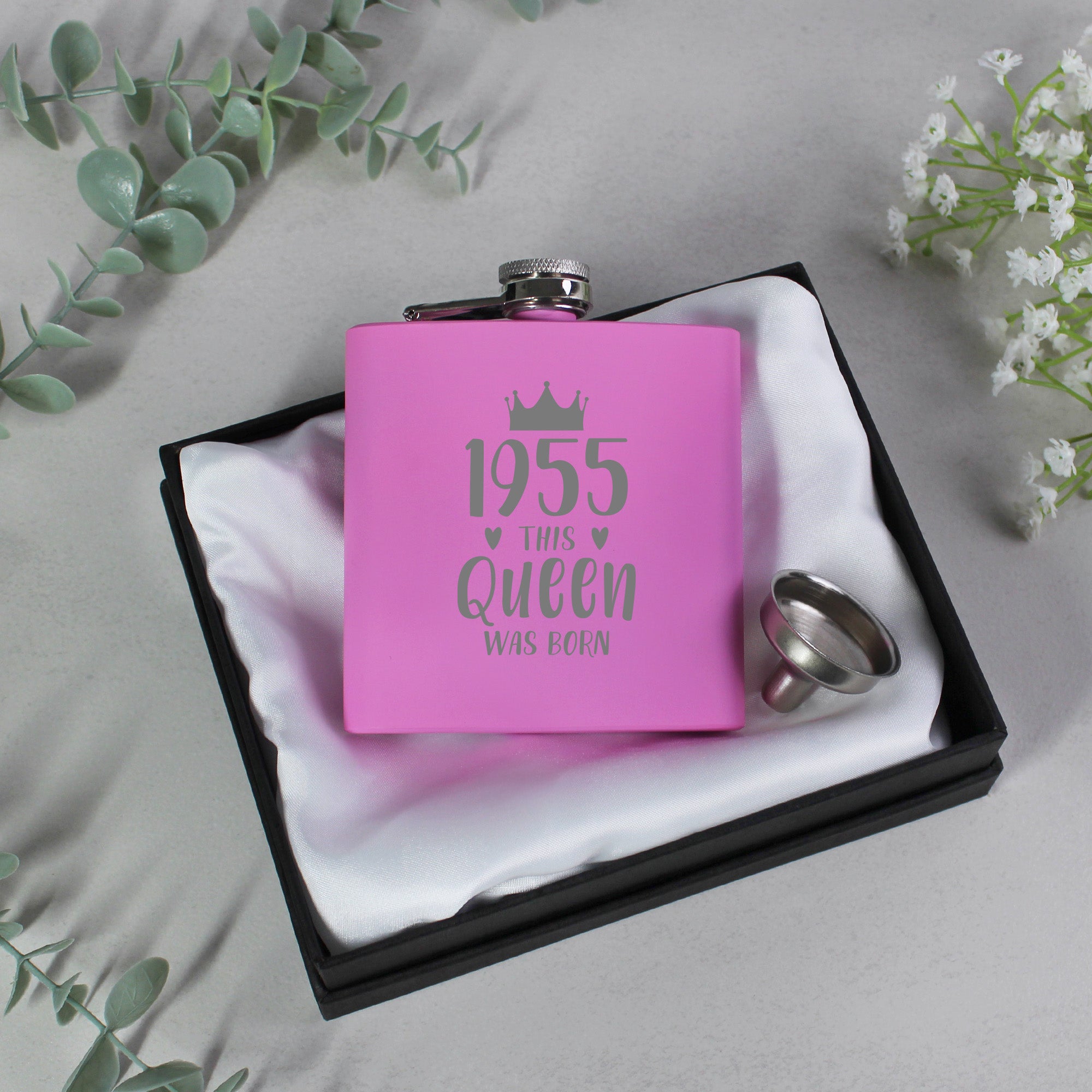 Pink Metal Hip Flask with "1955 This Queen Was Born" Design
