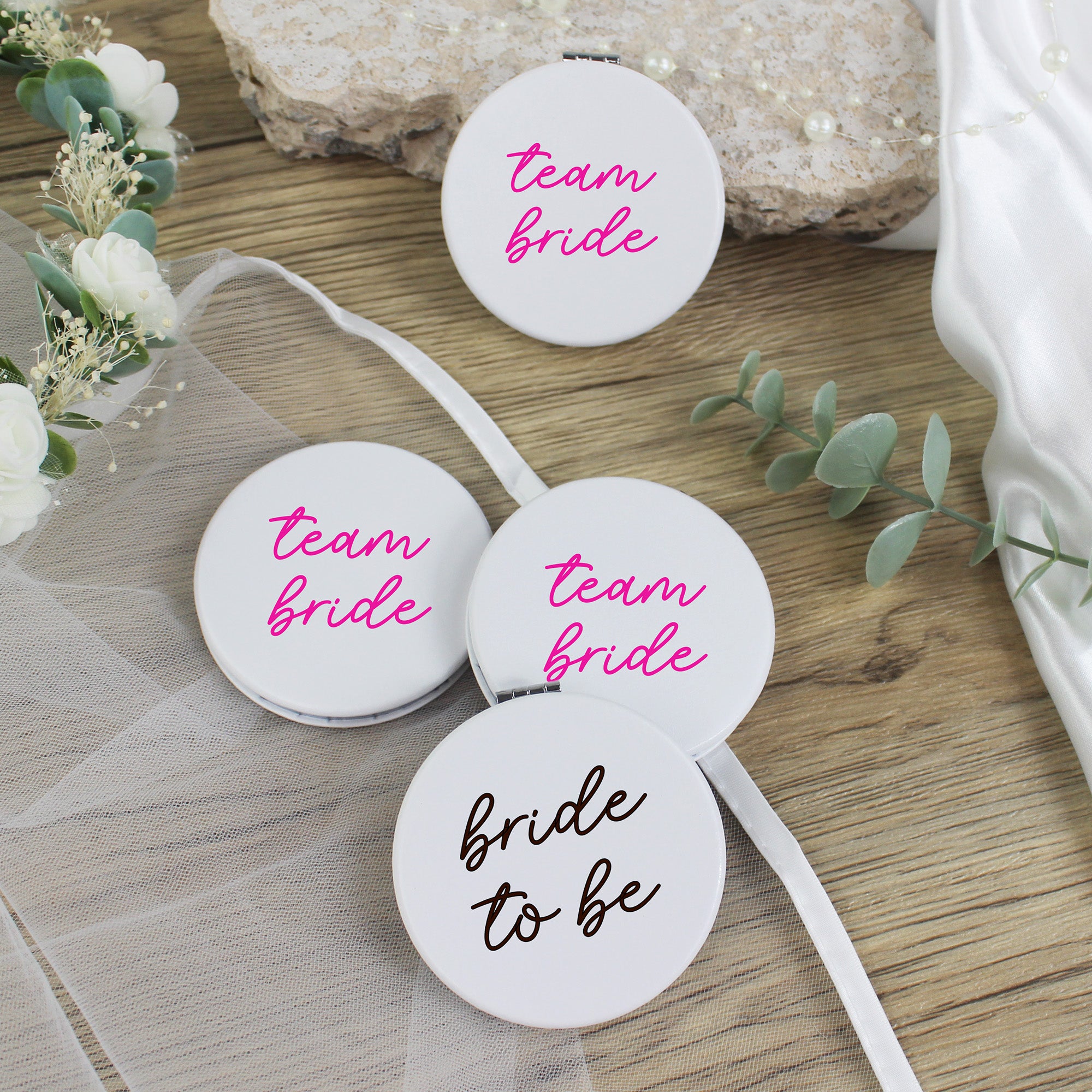 Each mirror features a sleek white design with “Team Bride” elegantly printed in pink, symbolising unity, elegance, and celebration. To make the bride shine even more, she has her very own exclusive white mirror, labelled either “Bride” or “Bride To Be.”